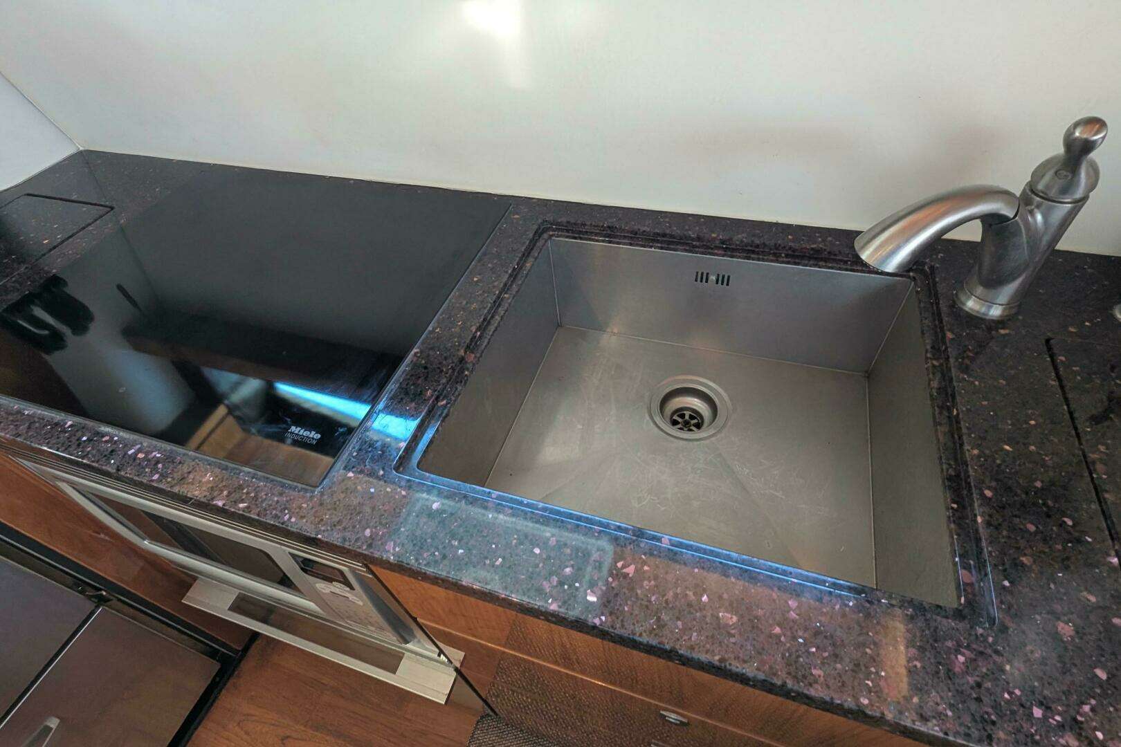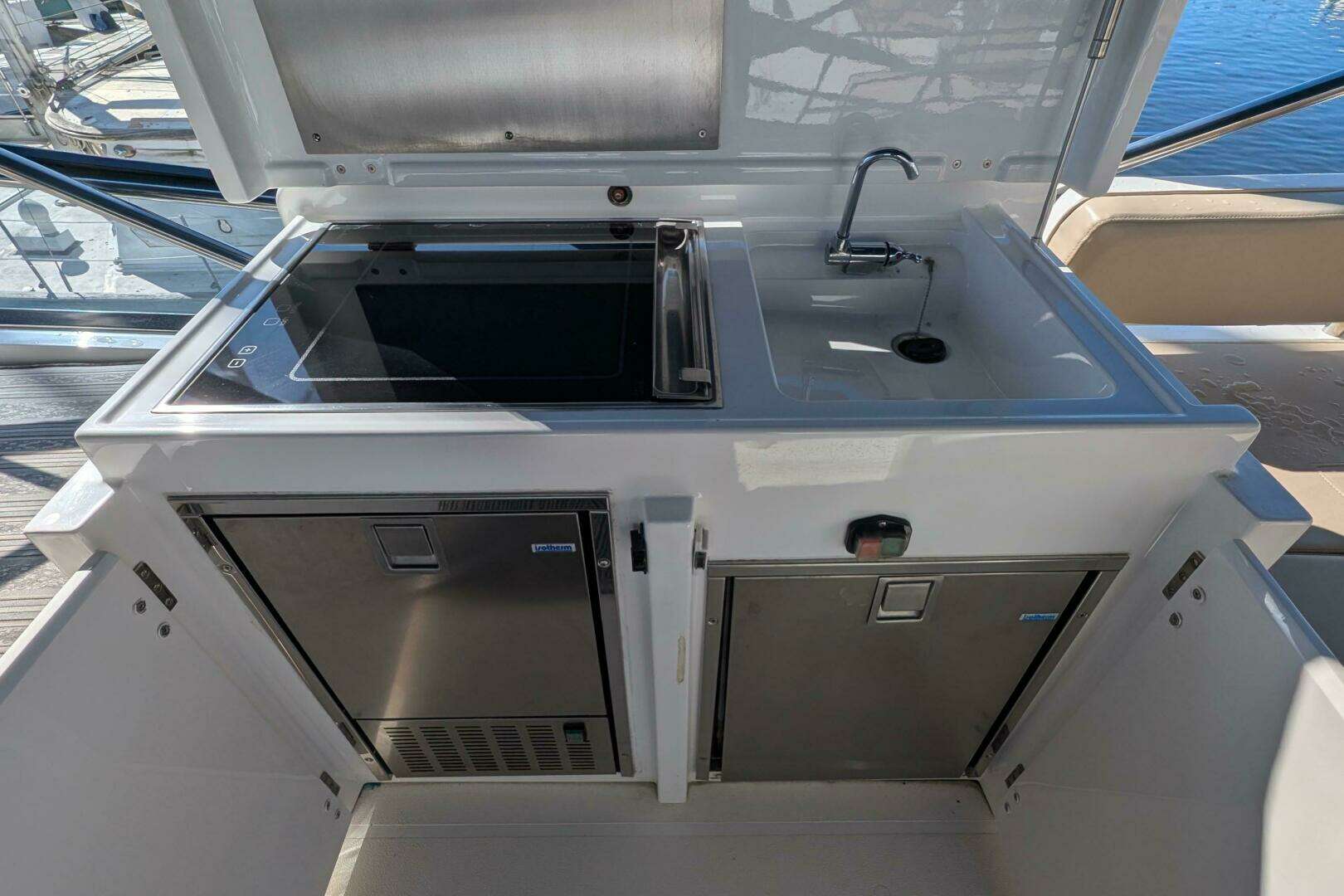 Up on the flybridge, there is enough room for a party. There is seating at the back with a large wooden table, and then sun loungers surrounding the helm forwards. In between is a BBQ, sink, reefer & icemaker to keep everyone watered and fed. And if the revelries go on beyond sunset, there is night lighting, and even underwater lighting for a moonlight swim...