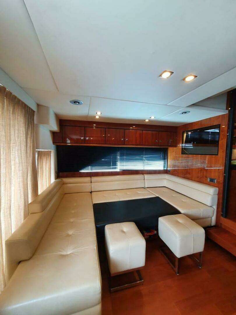 This 2010 Fairline Squadron 55 is the second generation of the model, which was for a while the flagship of the fleet. It has a beautiful blue hull, with a deep-v for a soft ride, and two powerful 853HP Caterpillar engines for a good touch of speed.