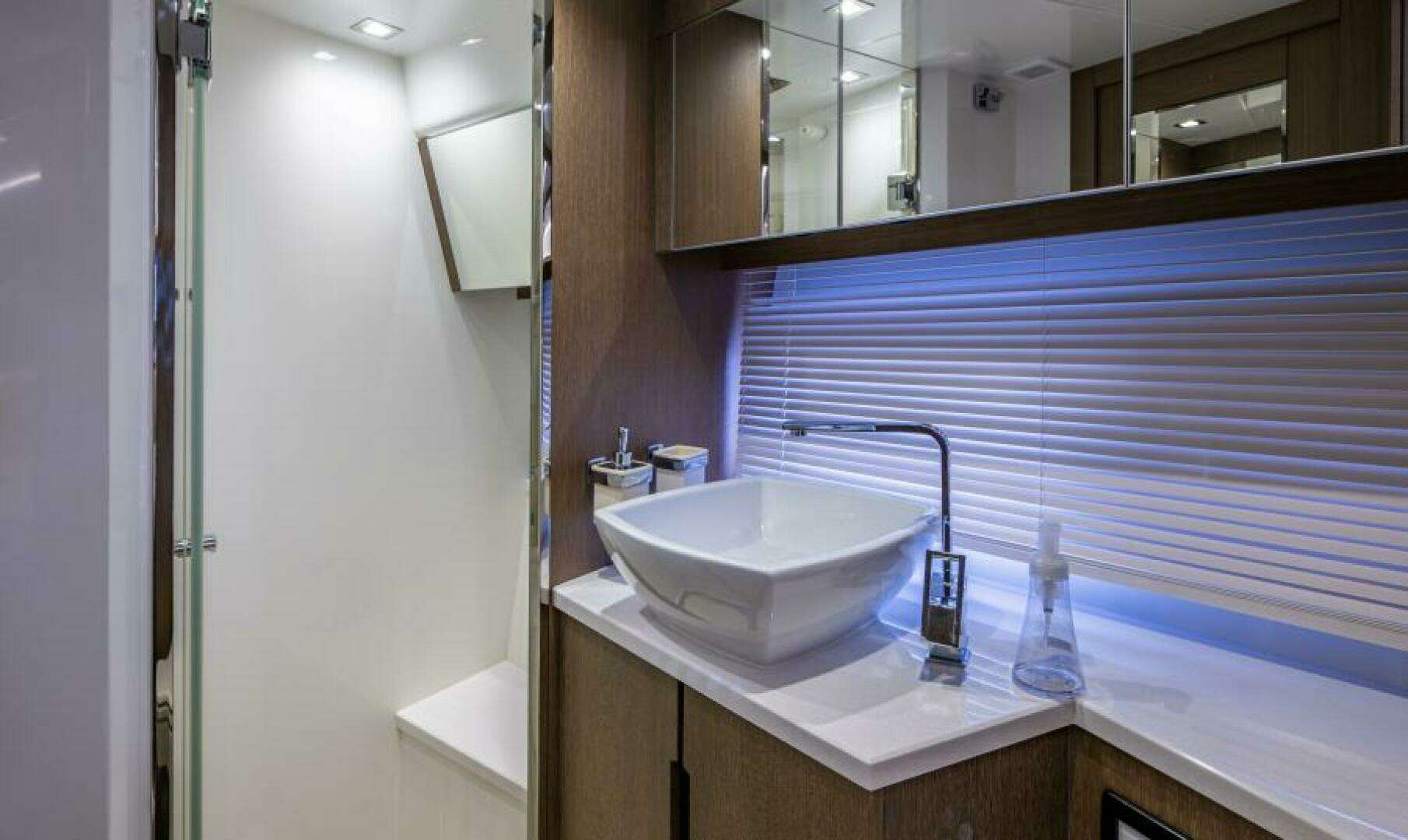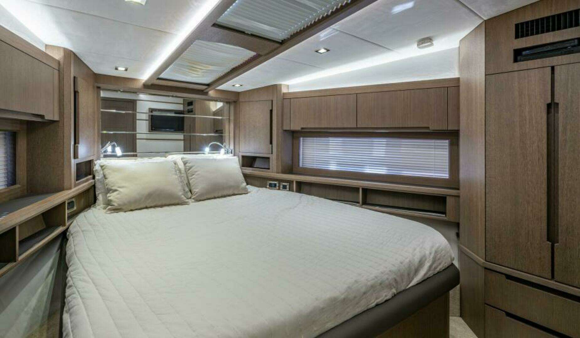 The forward VIP cabin has an en suite bathroom while the owners cabin is fitted with a make-up station and a comfortable lounge. Both bathrooms hold separate shower cabins and a clever solution with twin sliding beds can be found in the guest cabin. All quarters offer privacy and sufficient headroom.