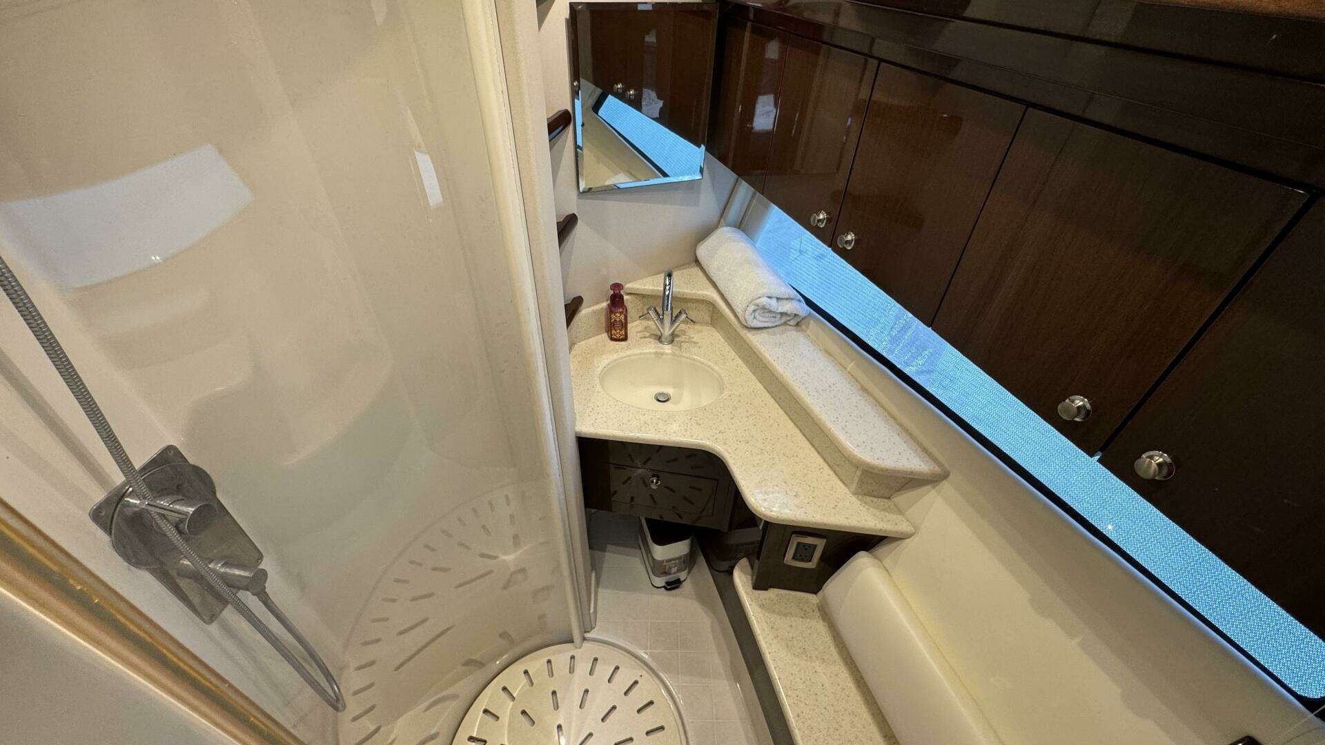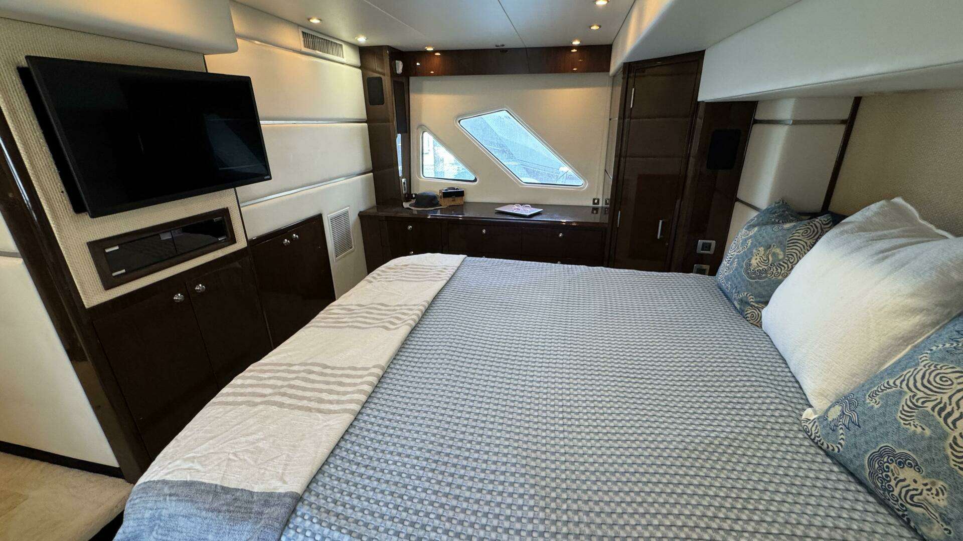 Below deck, the yacht features a three-stateroom, two-head layout, highlighted by a spacious full-beam master stateroom with private ensuite, a forward VIP stateroom with guest head access, and a twin-berth guest cabin.