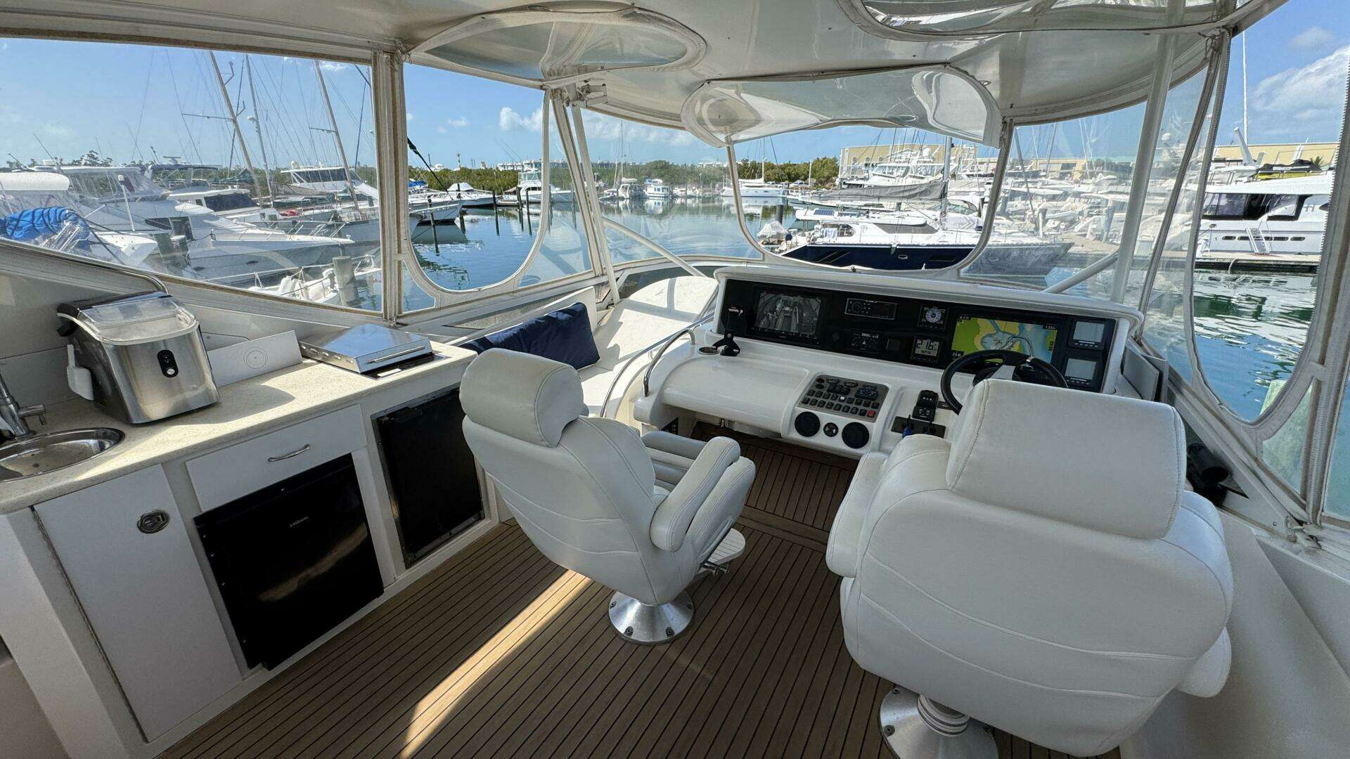 Outdoor entertaining spaces aboard Salty Side Eye are equally impressive. The yacht features a large fully enclosed flybridge with wet bar, grill, refrigeration, and generous seating, while the cockpit offers comfortable lounging space and easy access to the water.