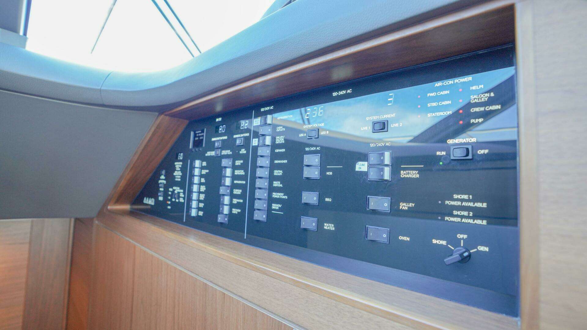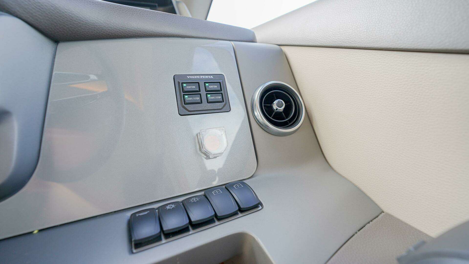 - Controls for joystick, bow thrusters, windscreen wipers, bilge pump and trim tab with indicators