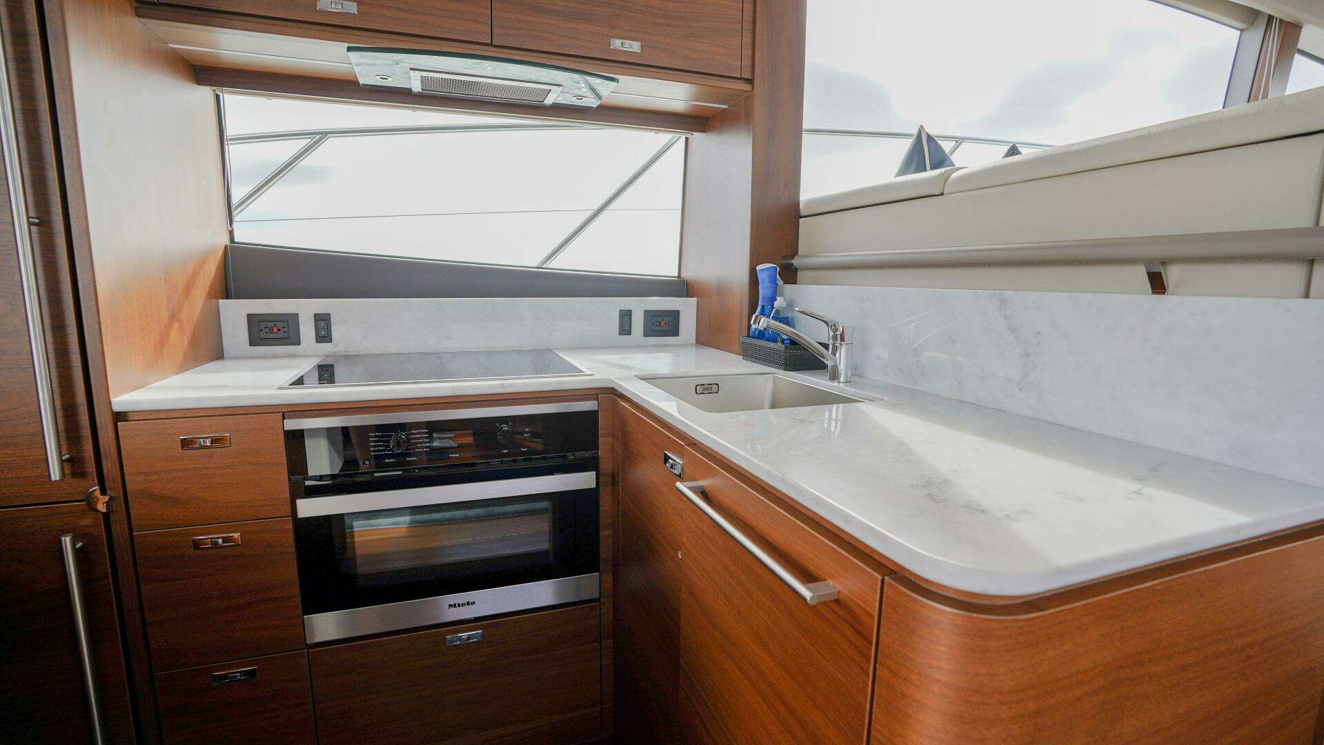 Moving forward, the well-appointed galley sits aft to starboard, perfectly positioned to serve both indoor and outdoor spaces, featuring modern appliances, ample storage, and seamless access to the cockpit.