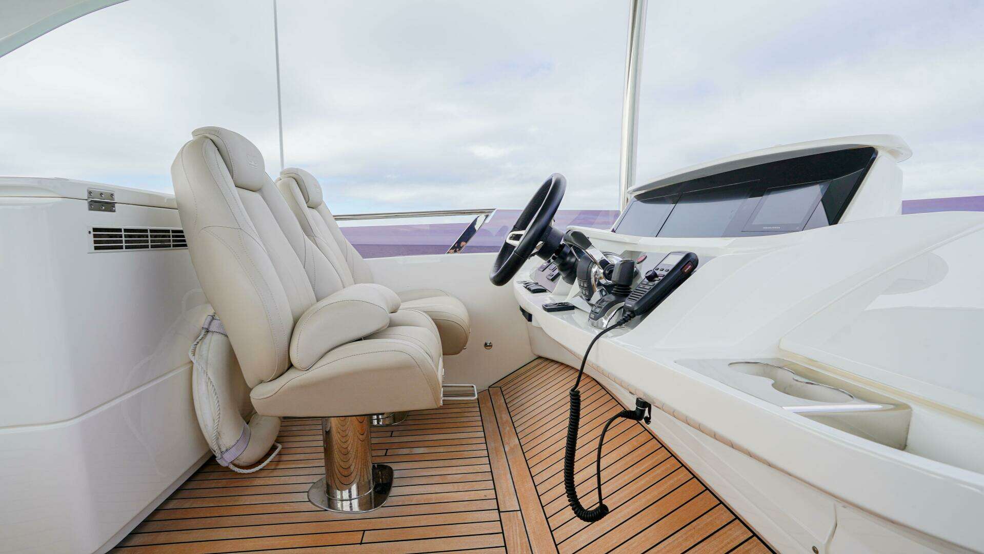 Just steps away, the helm offers a commanding vantage point with advanced navigation systems, twin helm seats, and outstanding visibility through Princess’ signature wraparound windscreen.