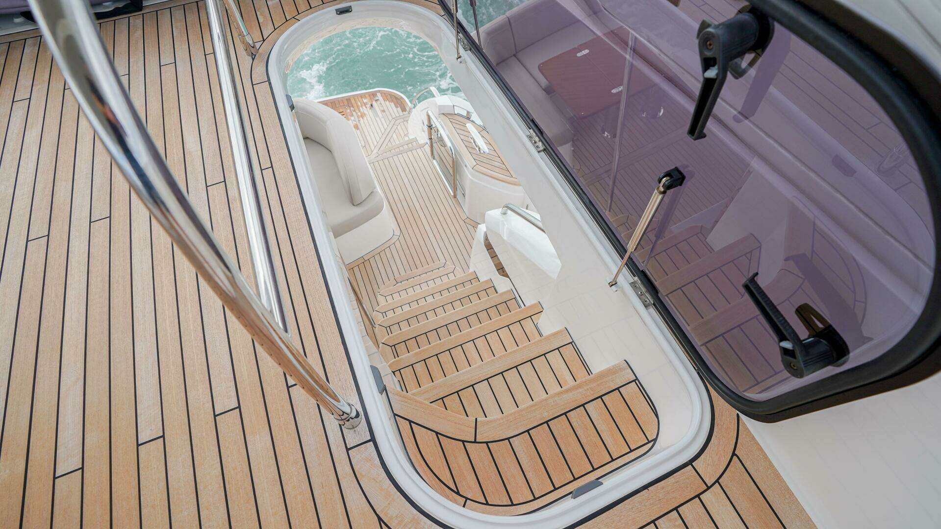 - Stainless steel framed sliding doors to cockpit with integrated hinging window aft of galley