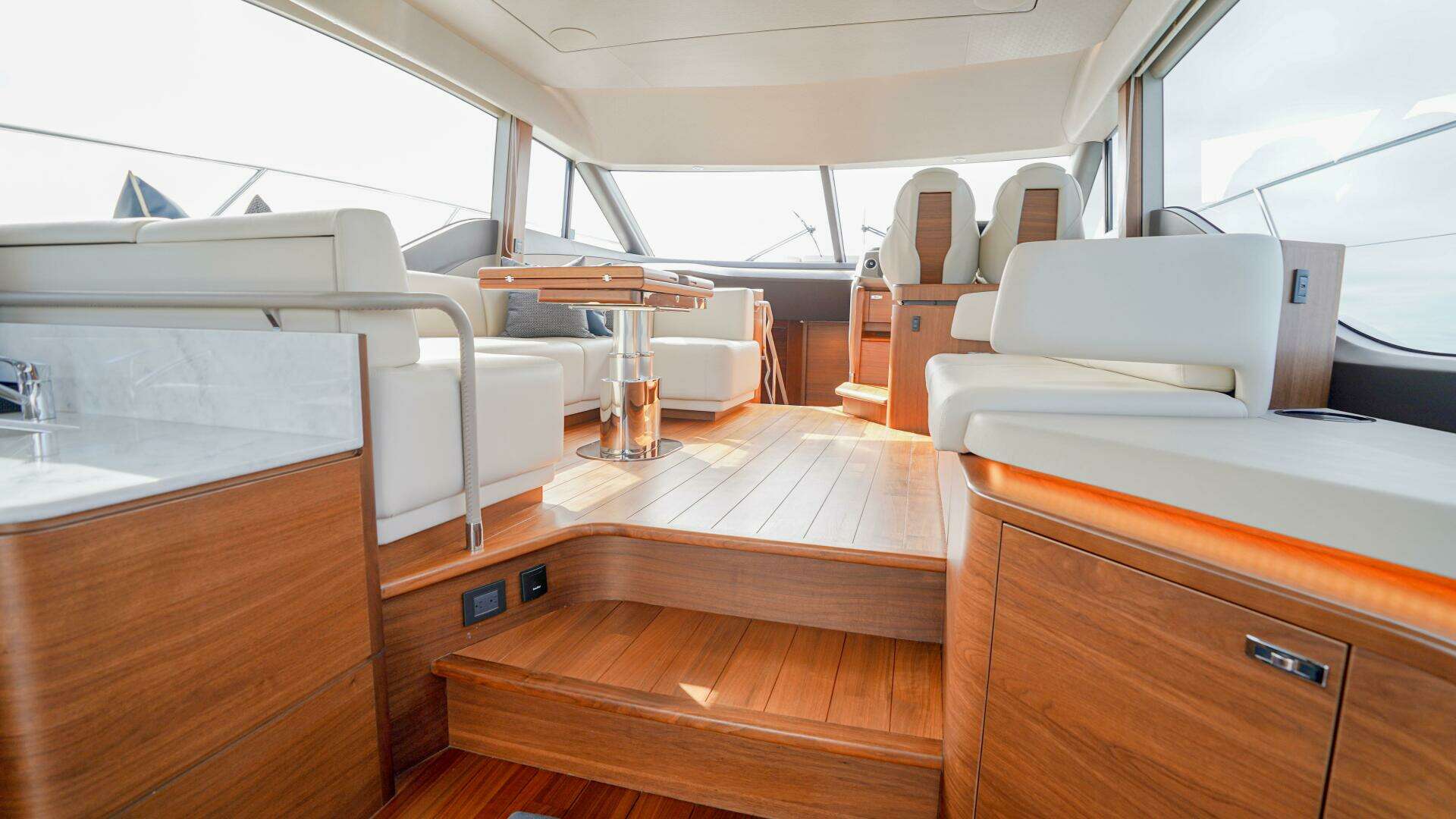Sliding glass doors open to reveal the light-filled salon, where expansive wraparound windows flood the interior with natural light and provide panoramic views that make the entire main deck feel bright, airy, and connected to the water. To port, a comfortable sofa invites guests to relax, while to starboard, additional seating and a dining settee create a social hub ideal for entertaining.
