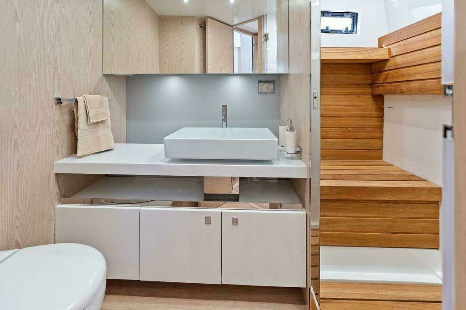 - Shower area with teak seat, adjustable mixer, and rain showerhead with chromotherapy