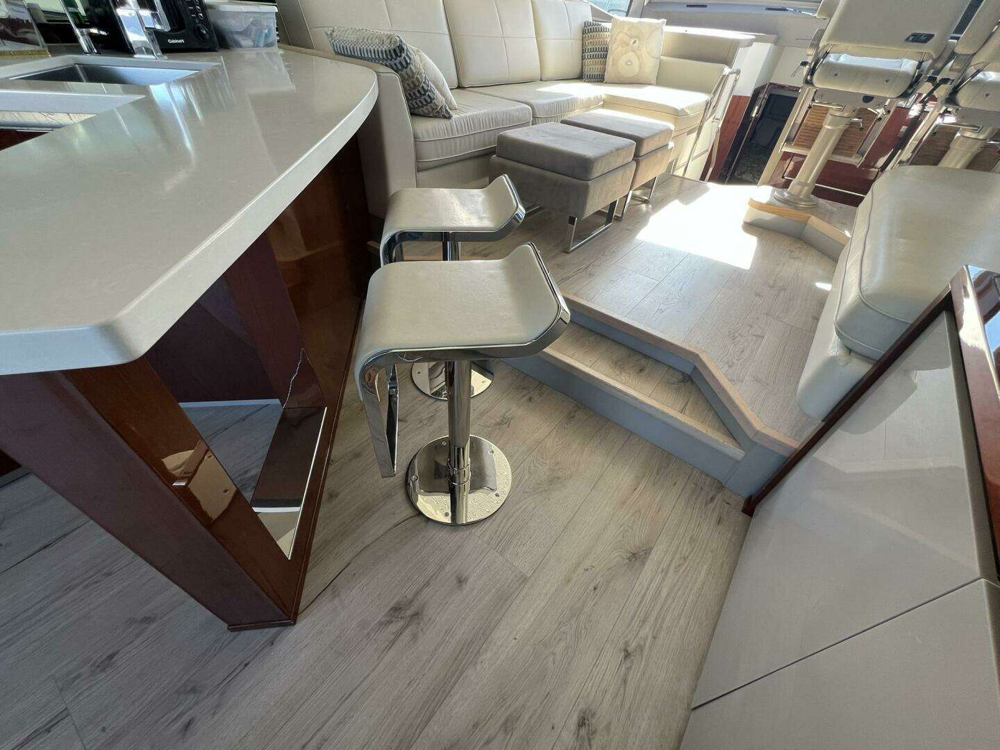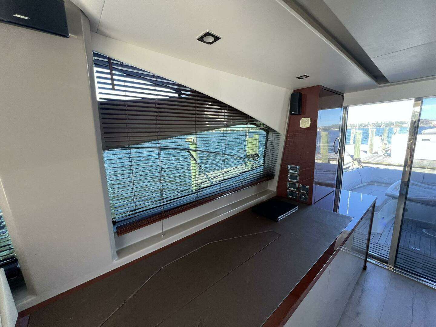 Triple sliding glass doors blur the lines between cockpit and salon, opening fully to create one continuous living space. The aft galley, finished in high-gloss cherry and lacquered cabinetry, includes dual drawer-style refrigerators, a Kenyon cooktop, and island bar seating for two.