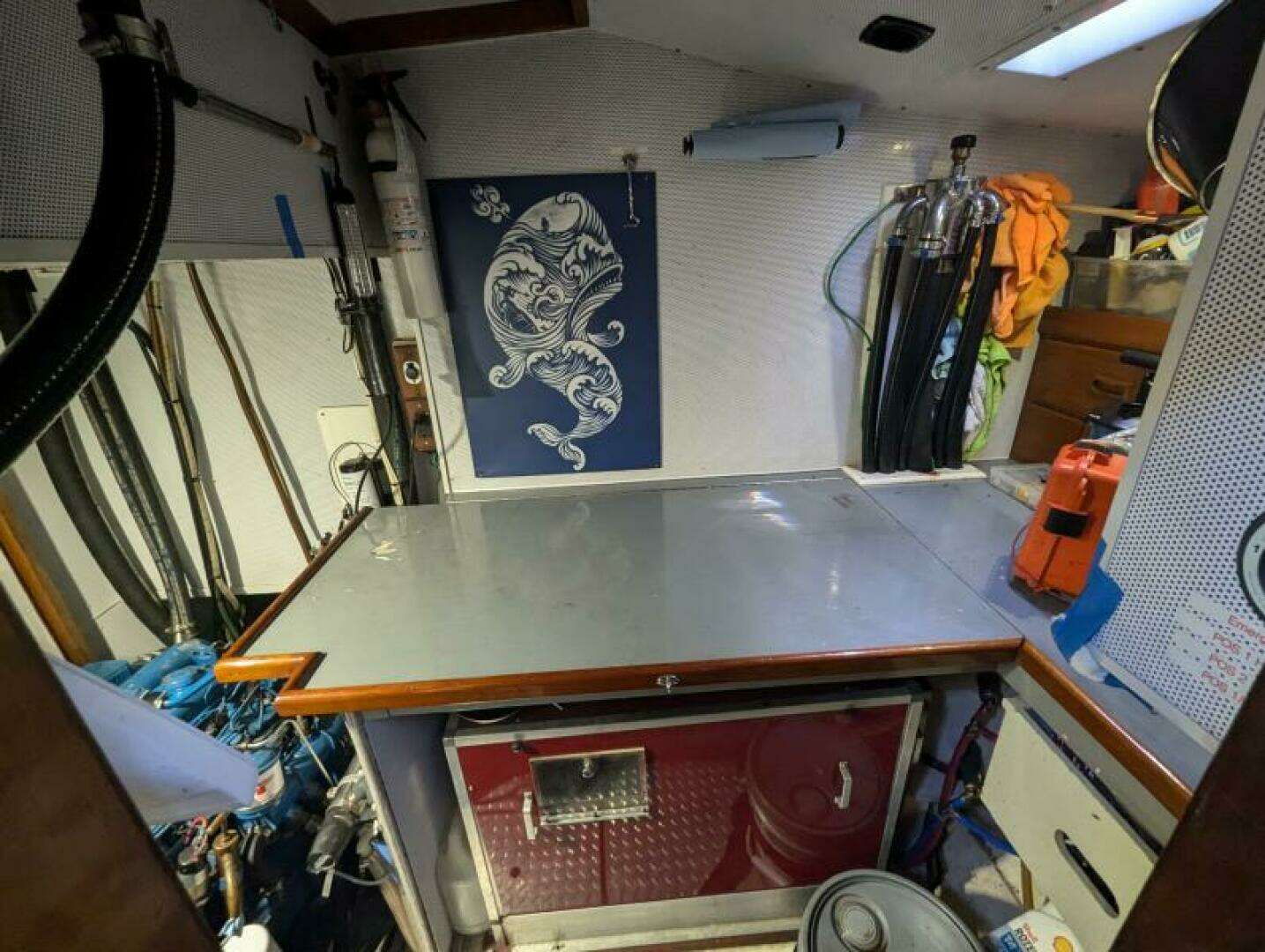 - Engine/Mechanical room to port, aft of and under companionway