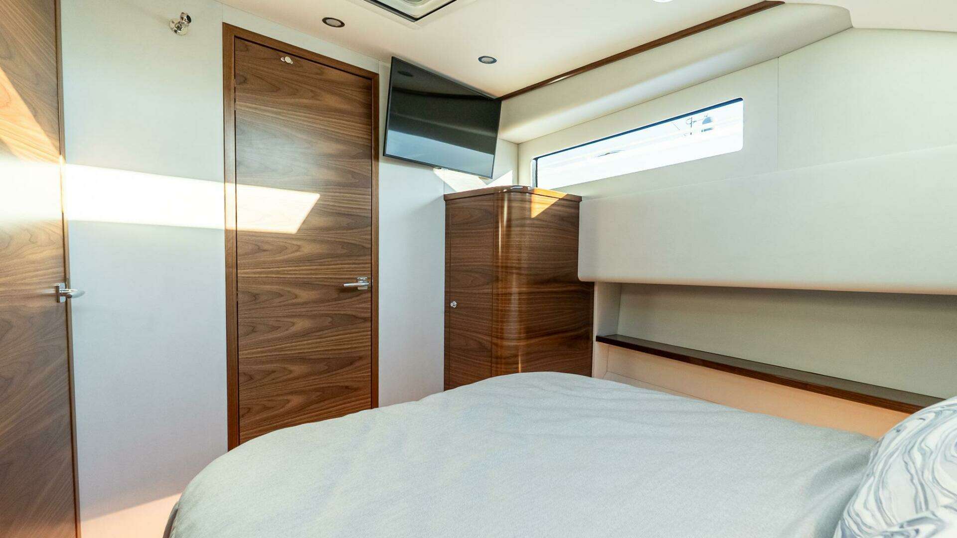 - Side-by-side aft stateroom berths with hanging locker and end tables