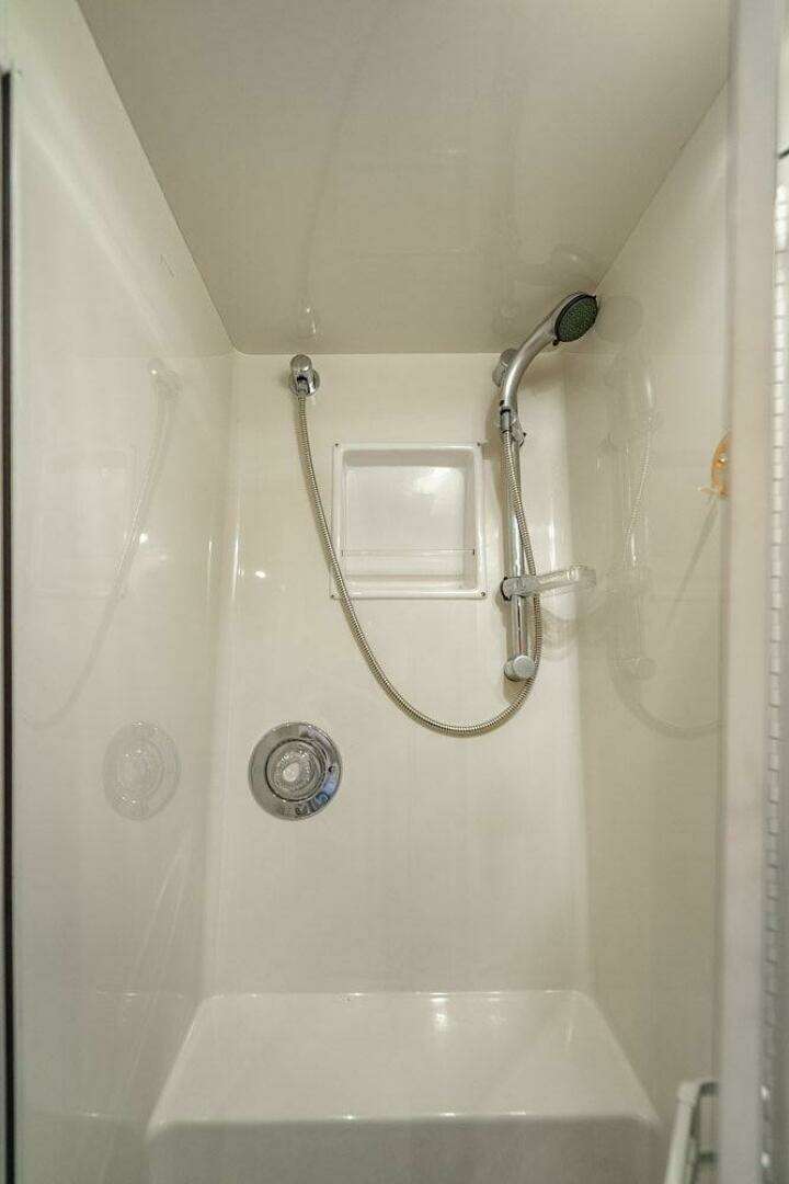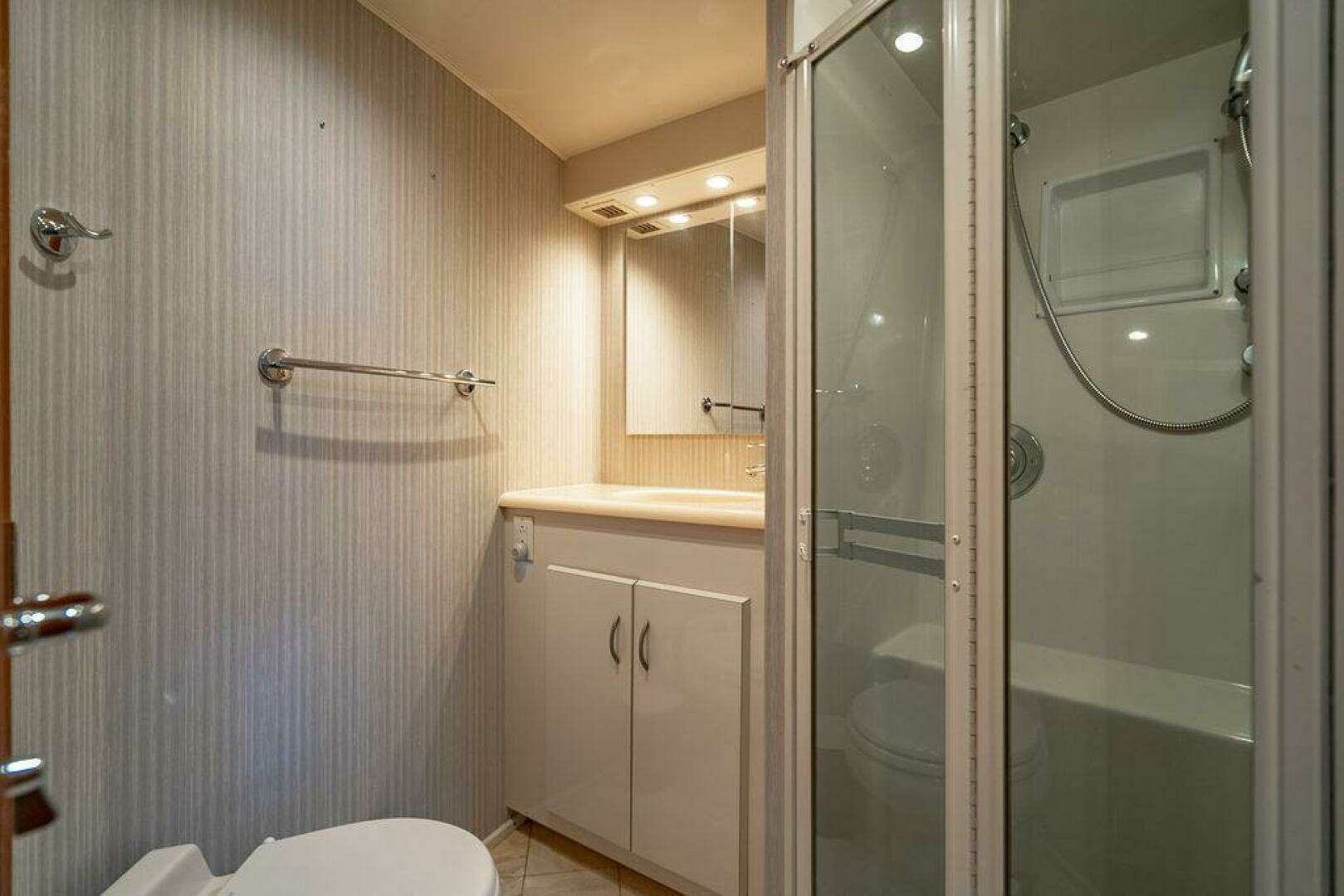 The master suite, located amidships on the port side, features a queen-size bed and a full en-suite private head. The forward cabin includes a double berth to starboard, and a raised single berth to port, while the third cabin on the starboard side offers upper and lower bunks. The flybridge is outfitted with a custom hardtop, Release helm and companion chairs, and forward companion seating. The helm console features an electronics cabinet with glass flip doors, providing secure and organized storage for navigation equipment.