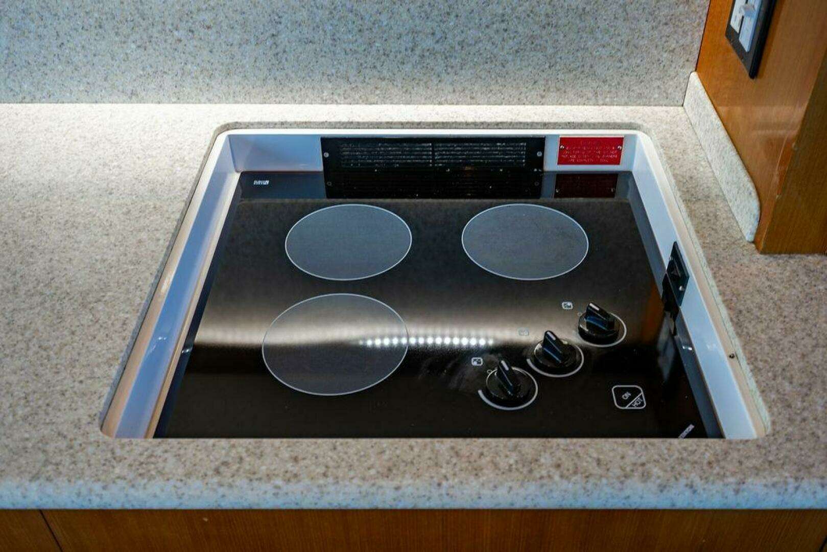 The galley is well-equipped with two Sub-Zero refrigerators with four drawers, a Sub-Zero freezer with two drawers, a Kenyon/Euro Kera three-burner electric cooktop, a Sharp convection microwave, and a U-Line ice maker. These features make meal preparation and storage convenient and efficient.