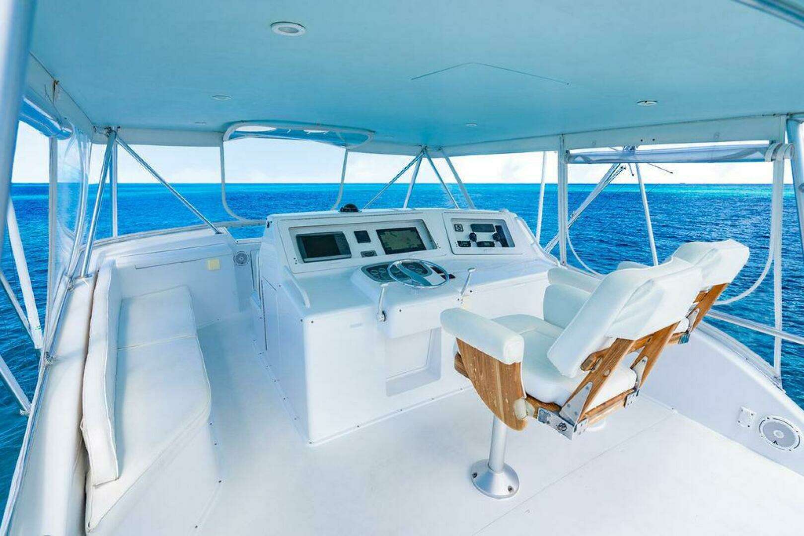 In the cockpit, there is a bait freezer with top access, two deep drop plugs, a remote control station (installed new in 2021), a Fusion media controller, and two underwater lights. The triple spreader Rupp Marine outriggers enhance its sportfishing capabilities.