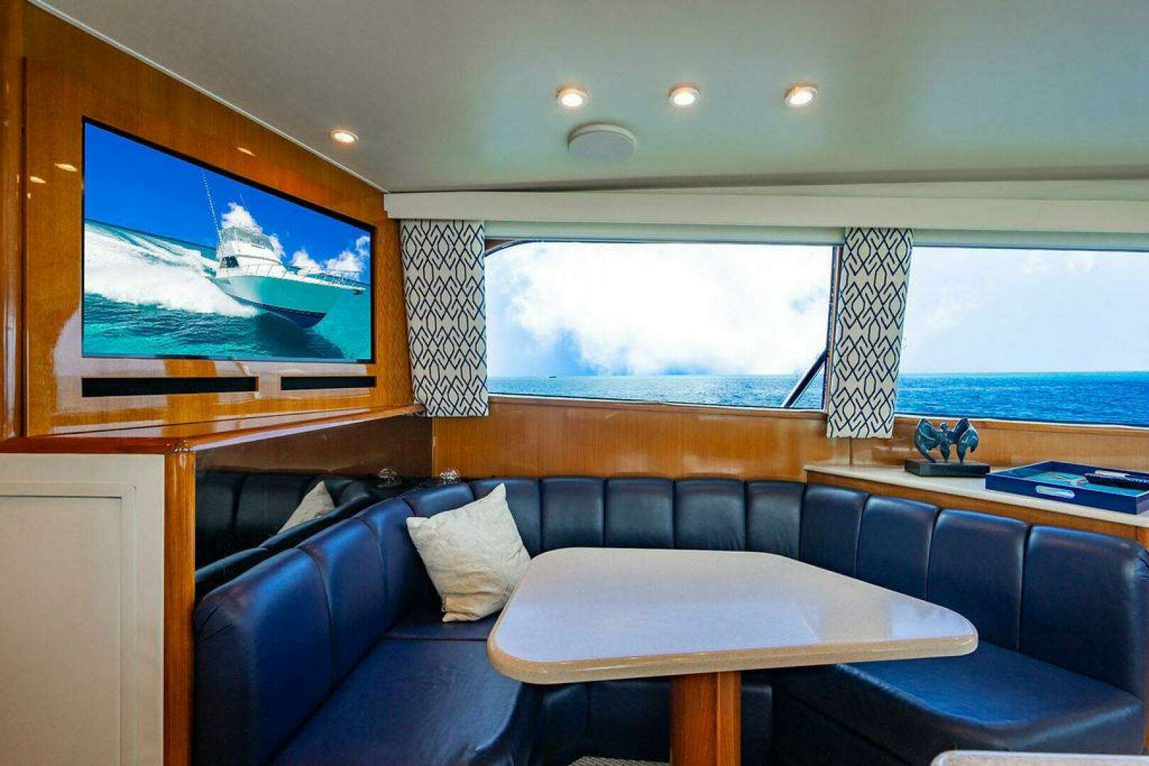 The open salon is designed with an L-shaped sofa, a galley, and cabinets housing the electrical panel. Below the cabinetry is a custom liquor cabinet. Moving forward, there is a C-shaped dinette. The entertainment system includes three TVs, DirecTV receivers, a Fusion stereo, and a Track-Vision satellite dish, providing comprehensive onboard entertainment.