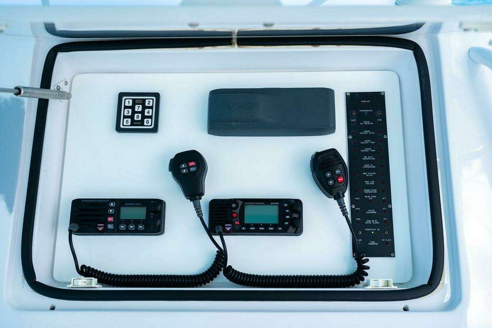 The electronics onboard were upgraded in 2021 and include a GPSMAP 4212, GPSMAP 8616, Simrad autopilot, VHF Standard Horizon Eclipse DSC+, VHF Standard Horizon Eclipse, a Garmin radar, and a Fusion media player with JL speakers. These advanced systems ensure reliable navigation and communication.