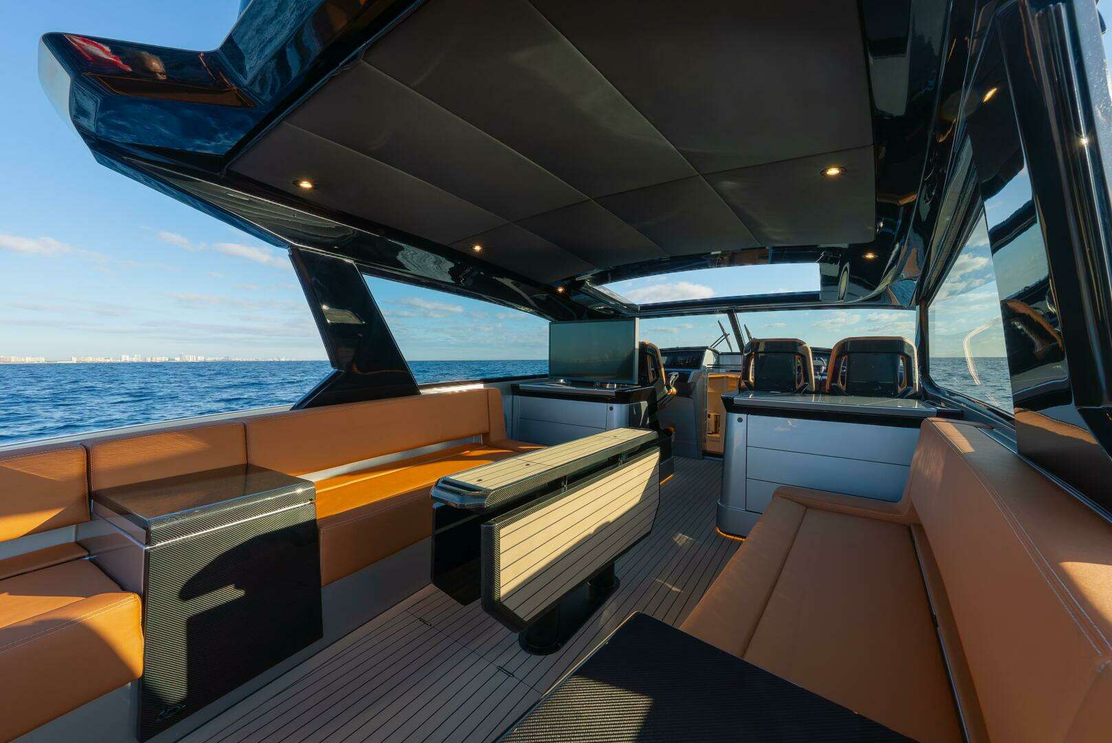 On deck, the 55 HT offers a beautifully arranged layout with generous seating. The cockpit features a U-shaped lounge and a dining table, perfect for alfresco meals, while spacious sunbeds on the fore and aft deck provide optimal comfort for sunbathing. The hardtop incorporates an opening sunroof, ensuring owners can adjust their environment at will.