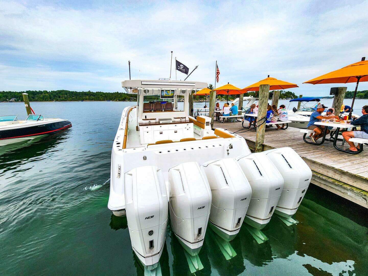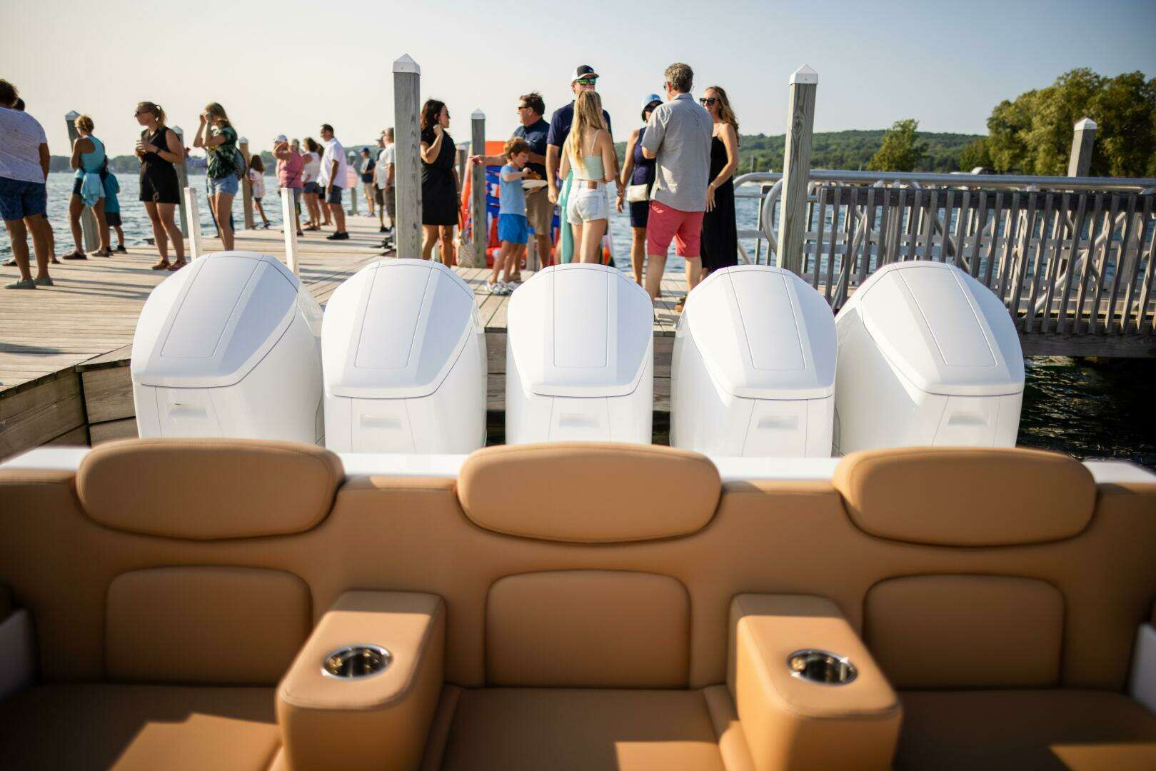 Powered by quint (5) Mercury V12 600-hp outboards and stabilized by a Seakeeper 9, this flagship delivers blistering speed, remarkable efficiency, and a ride so refined it redefines the category it created.