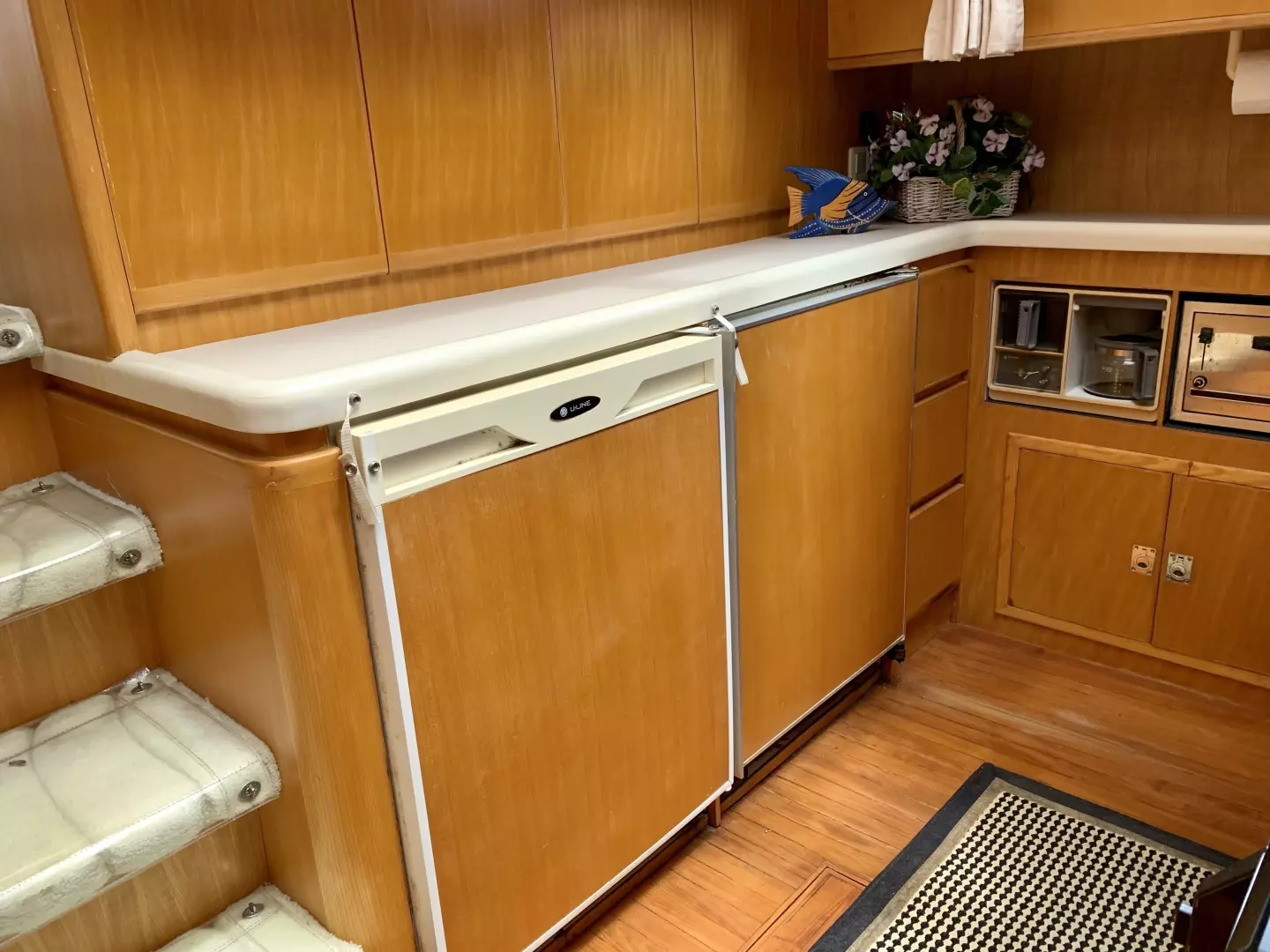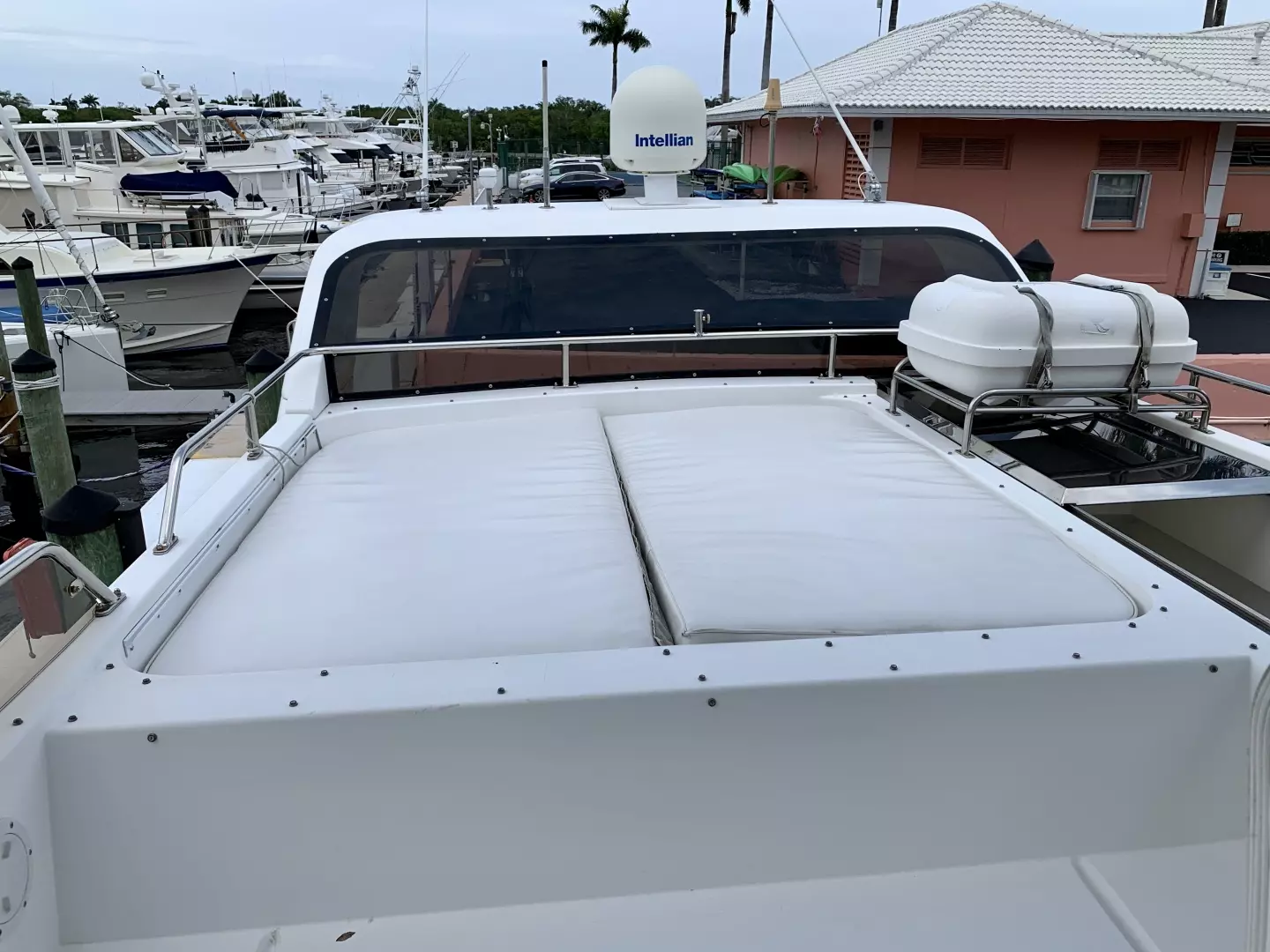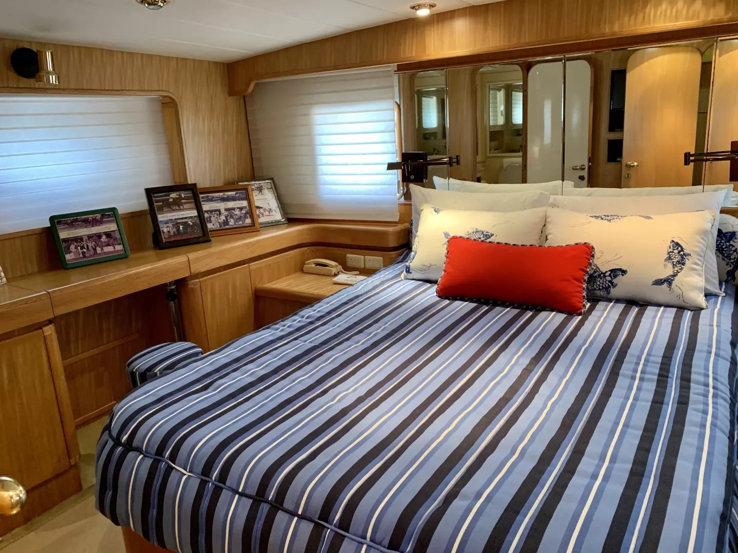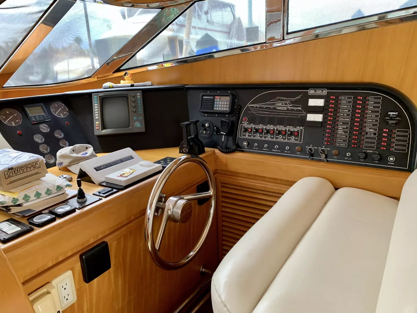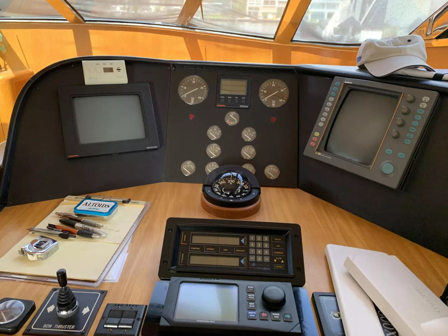 Lucky Duck features an oversized and easily accessible swim platform for great access to the water. When entering the vessel from shore you can't help but notice the brand new teak sole and the oversized cockpit area which is protected by an overhead bridge extension. You enter the large main salon through double glass doors and the flow od the room lends itself to a great entertainment area as well as a perfect place to relax after a day on the water. Forward to starboard is your lower helm complete with electronics and comfortable seating for that rainy day when you prefer to be indoors. To the port side and down a few steps is the well equipped galley offering all the conveniences of home. Forward you will find the Guest Staterooms, first with twin beds, ensuite head and shower. Forward of that is the VIP stateroom with Island Queen Berth and ensuite head and shower. The bright, large full beam master stateroom is aft with night tables on both sides. She has generous drawer space and hanging lockers and all the comforts you need for extended cruising. The Master is accessed by a staircase aft in the salon on the port side. East access to the large bridge is via a molded staircase from the aft deck. The captain will have comfortable seating, electronics at the bridge helm and outstanding visibility. Lucky Duck is a great performer and together with her bow thruster she is a pleasure to run.