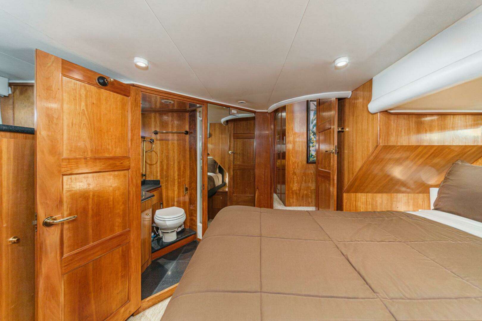 The spacious interior is arranged with a three-cabin, two-head layout. The salon features wood floors and comfortable L-shaped sofas. The master stateroom includes a separate washer and dryer.