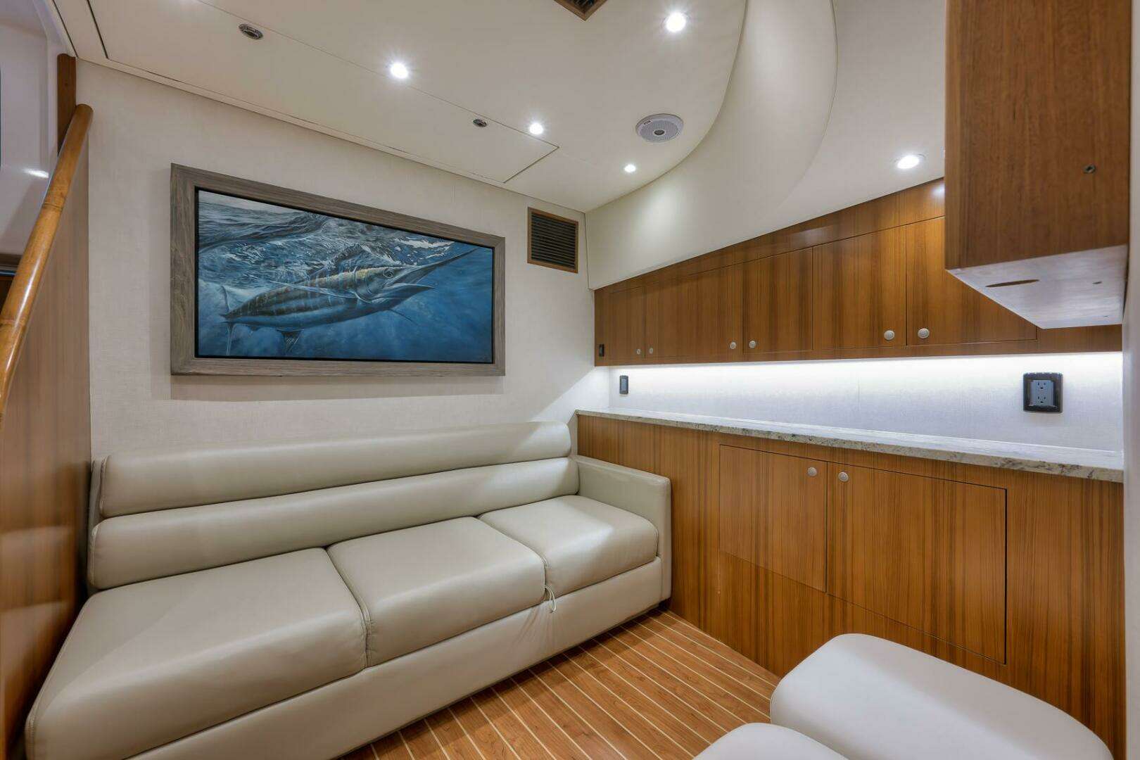 The salon is designed for relaxation and entertainment, featuring a comfortable couch and inviting atmosphere.