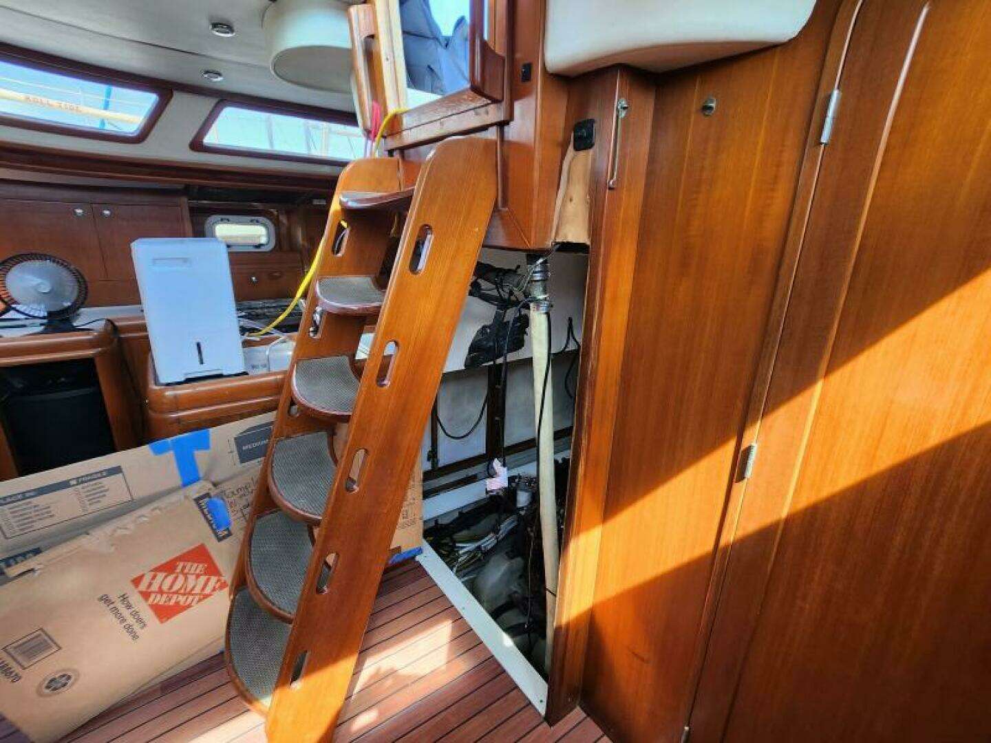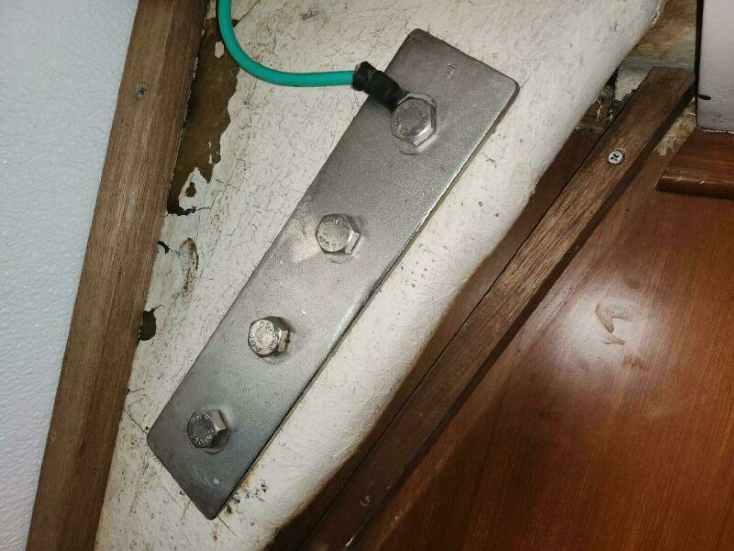 Due to clogged scuppers, rainwater overflowed from the cockpit down the companionway and soaked engine room insulation. The affected wood is non-structural and has been removed.