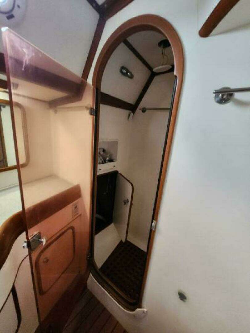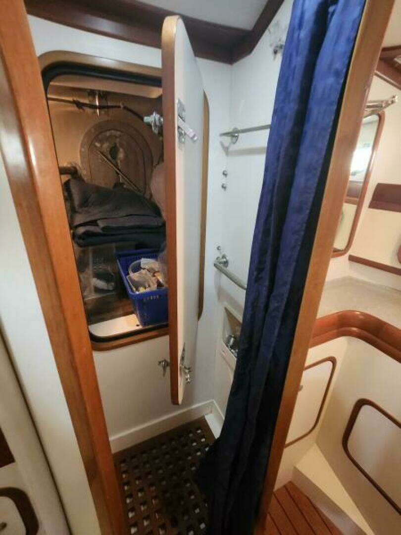 Cabinets: Ample storage around galley, Trash cabinet door missing