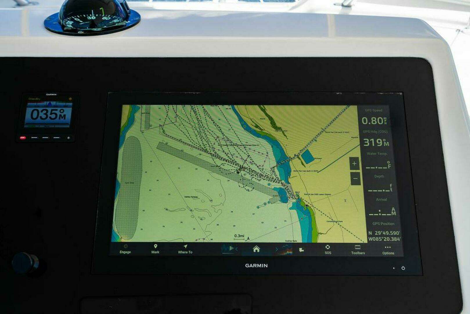 - Refit flush mounted glass bridge featuring (2) 24 in. Garmin multi-function displays for chart plotter, radar, and sonar. AIS capabilities