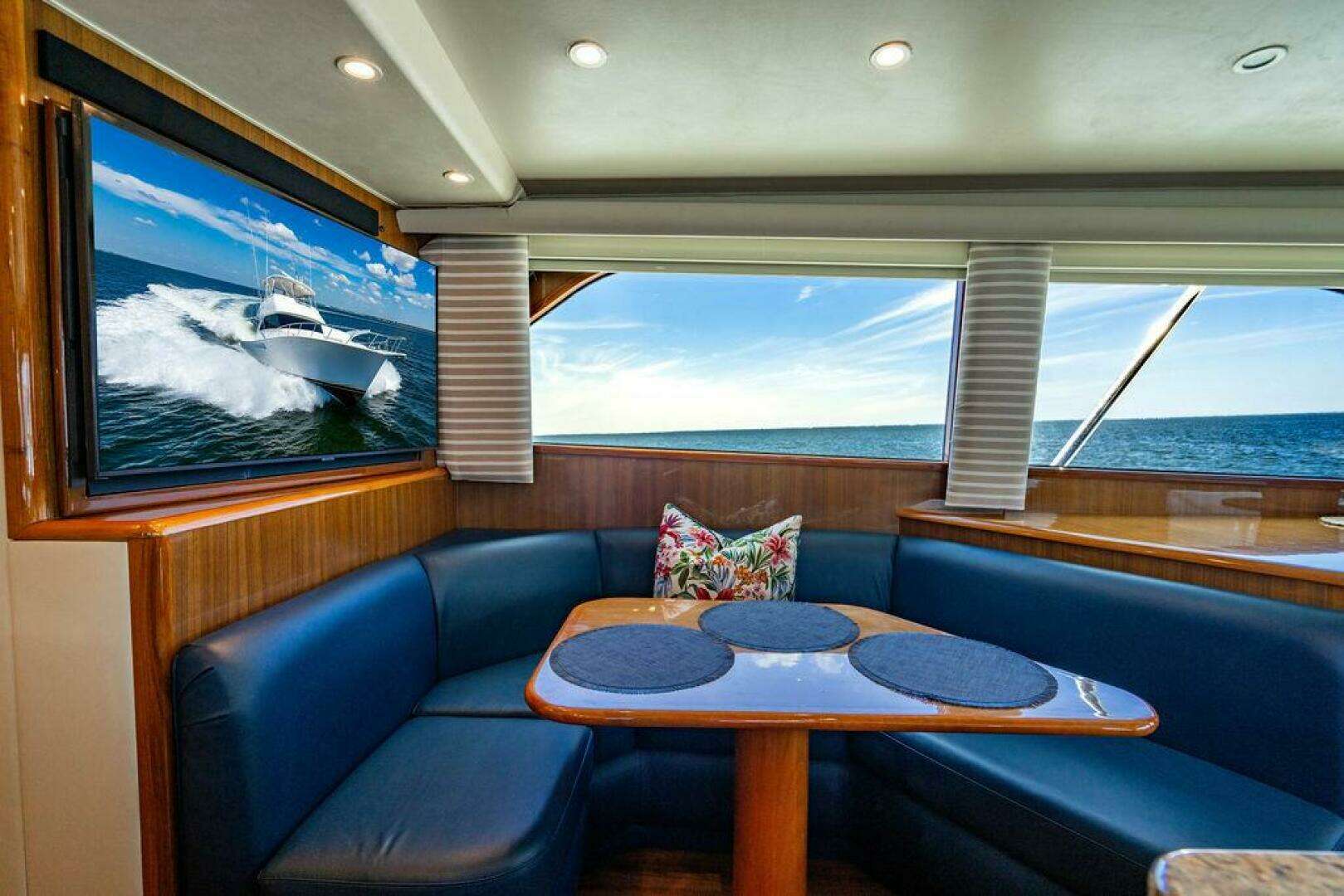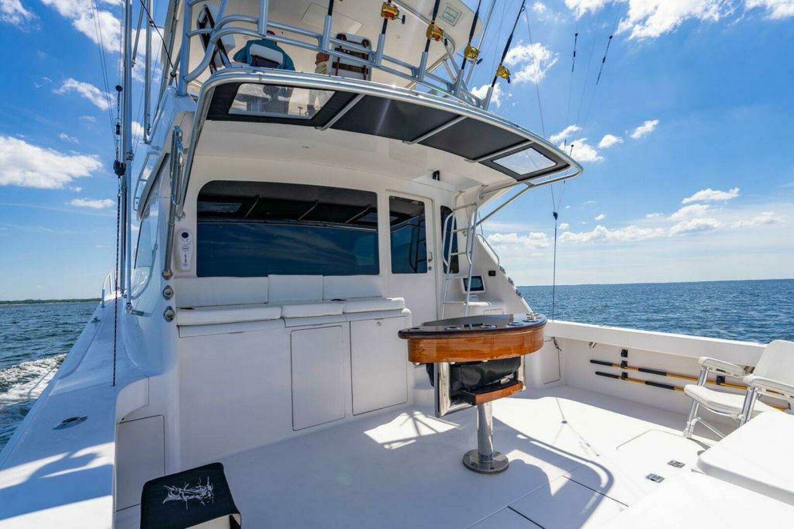 Fly bridge is easily accessible from starboard side cockpit ladder. The 56 Viking features the largest and best laid out flybridge in her class. She has excellent visibility with ample seating and storage.