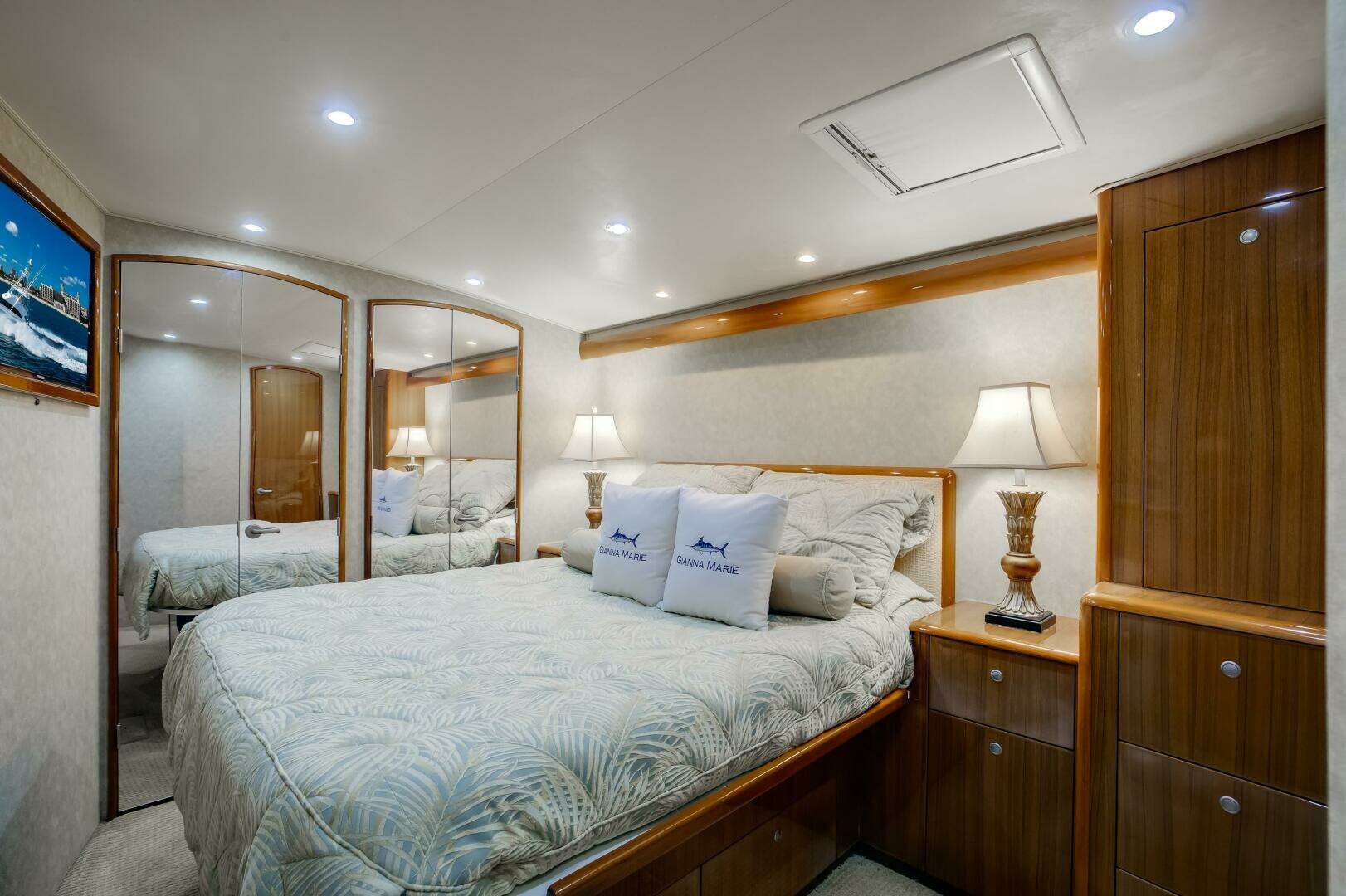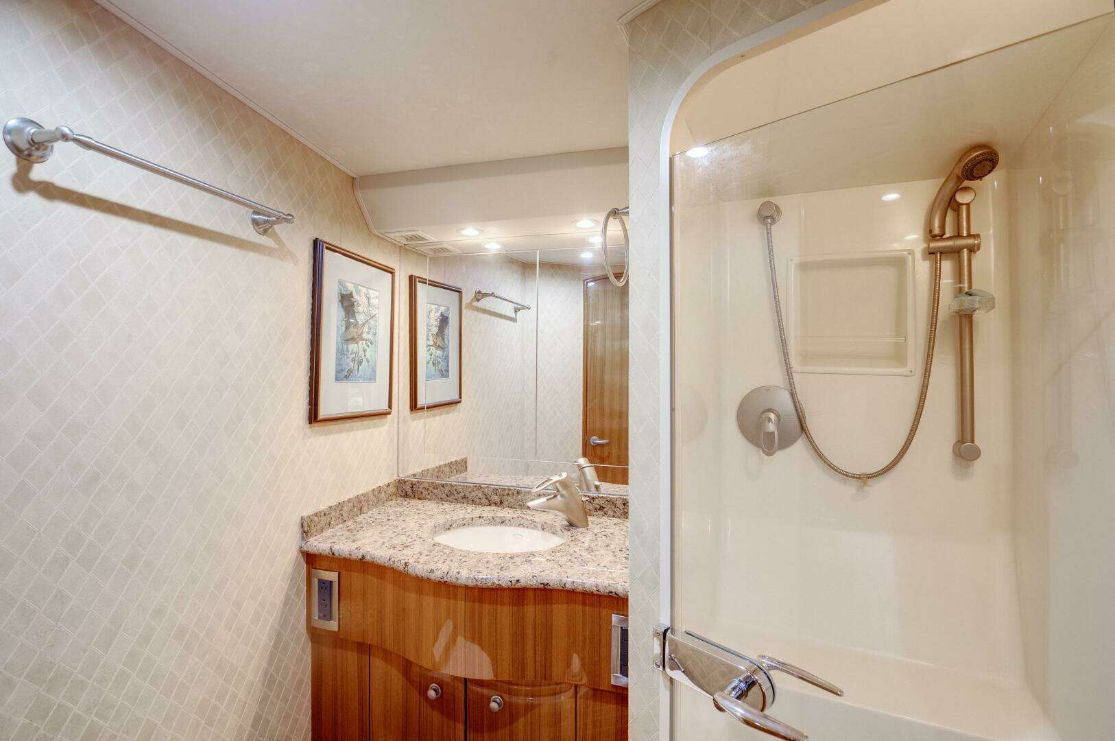 This vessel features the extremely popular 3 stateroom/2 head layout with athwartship master berth, VIP layout forward, and crossover berths in the starboard stateroom. Both heads are upgraded with custom 1 piece frameless shower doors, Amtico teak soles and Sea Land Magnum Opus heads. The hanging lockers are maple lined in all three cabins and numerous custom touches are evident. The washer and dryer are accessed in the guest head.