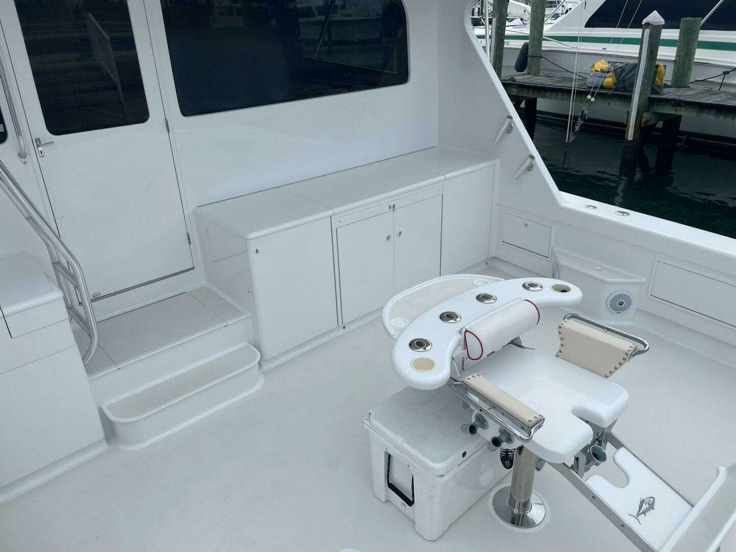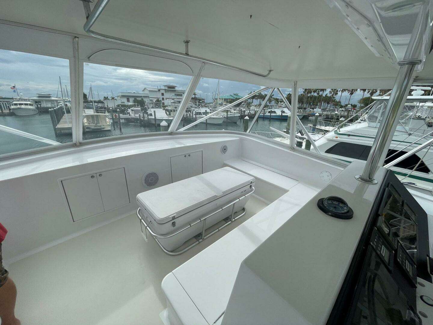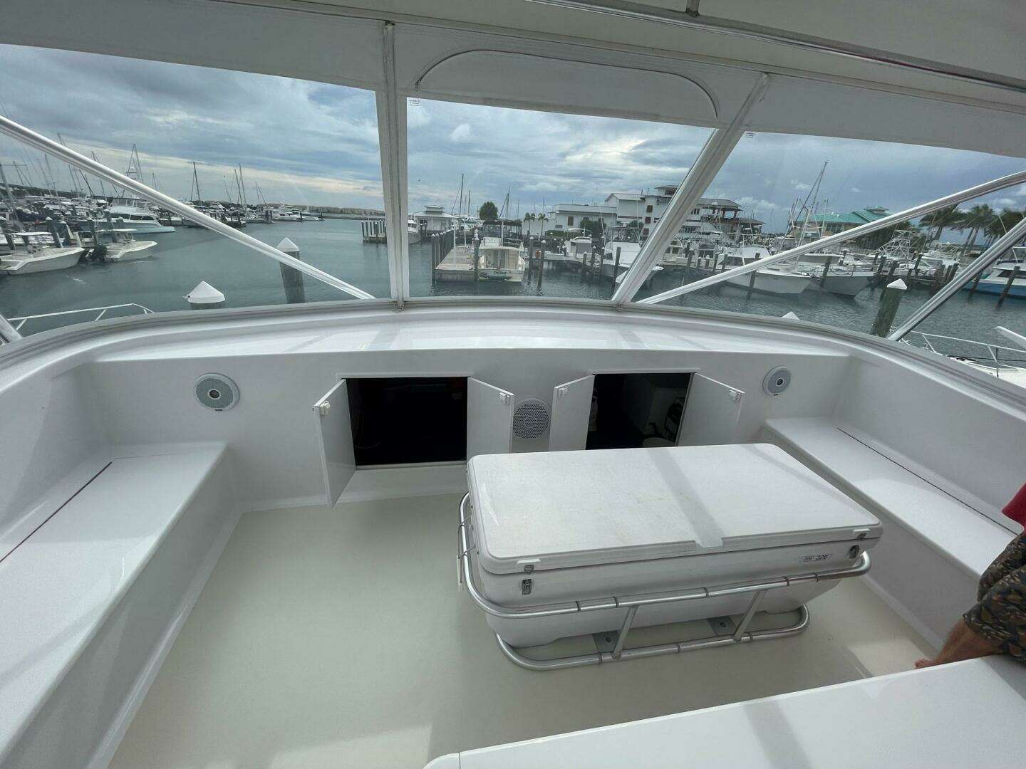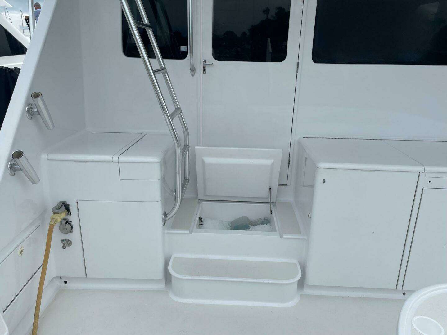 - Large removable cooler forward of flybridge console seating can double as table and is secured to deck with custom aluminum railing