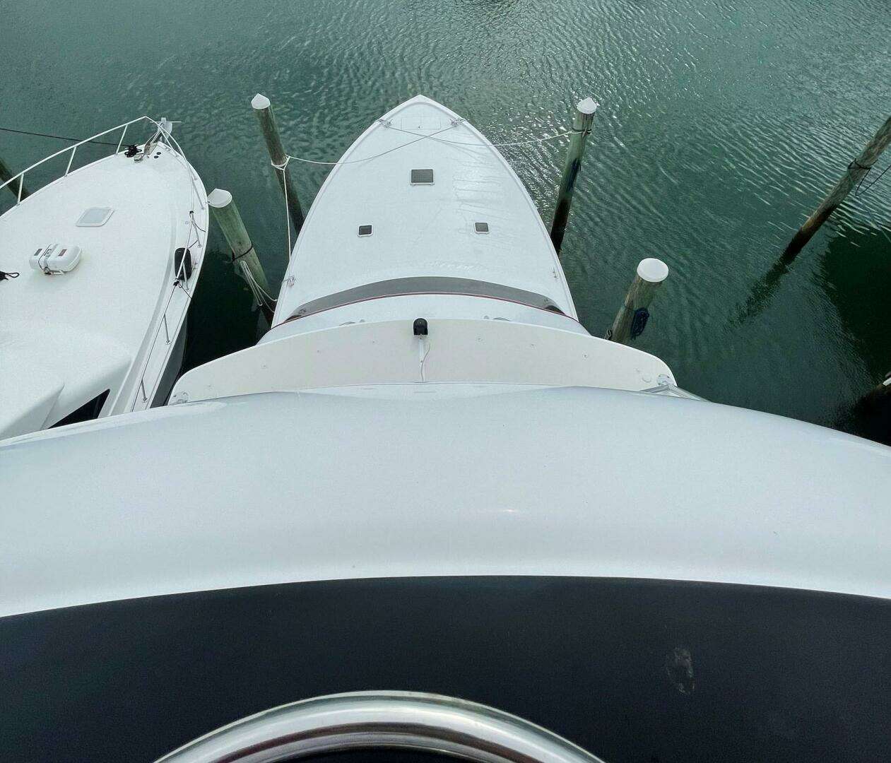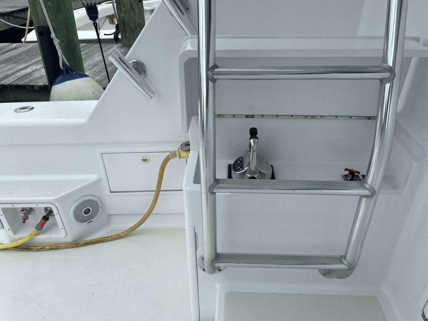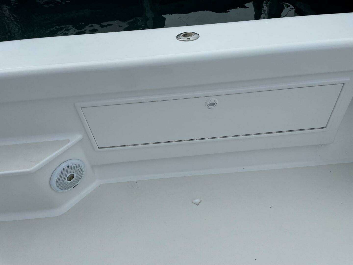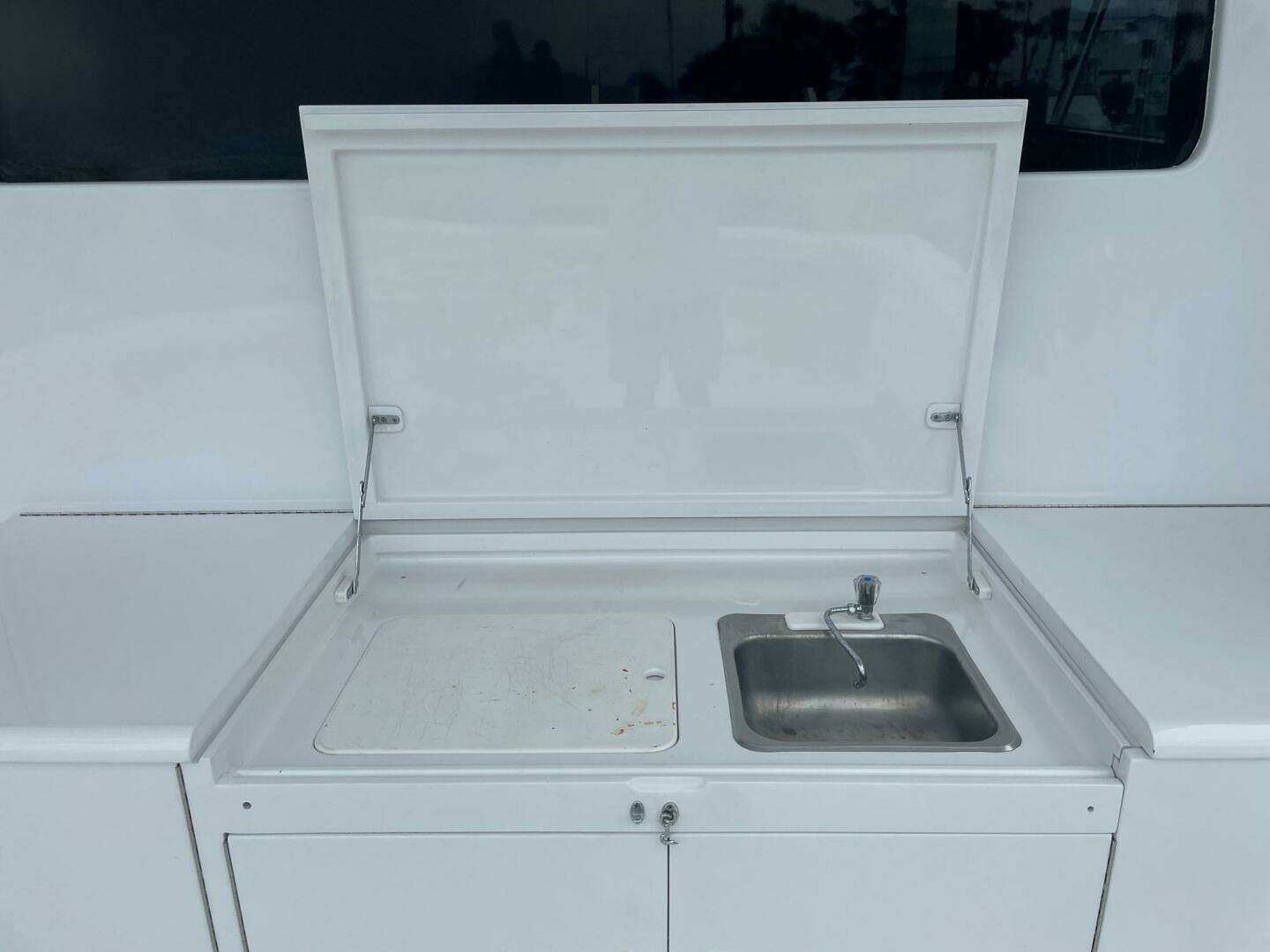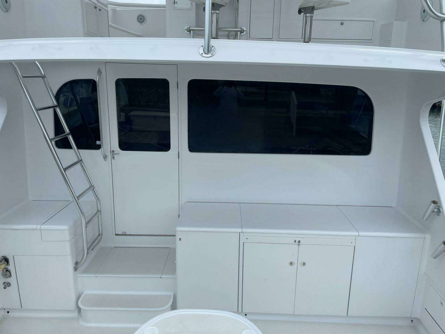 - Large removable cooler forward of flybridge console seating can double as table and is secured to deck with custom aluminum railing