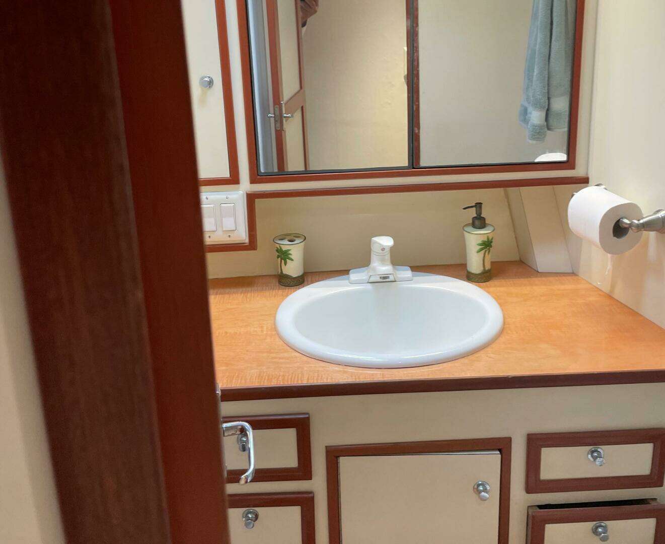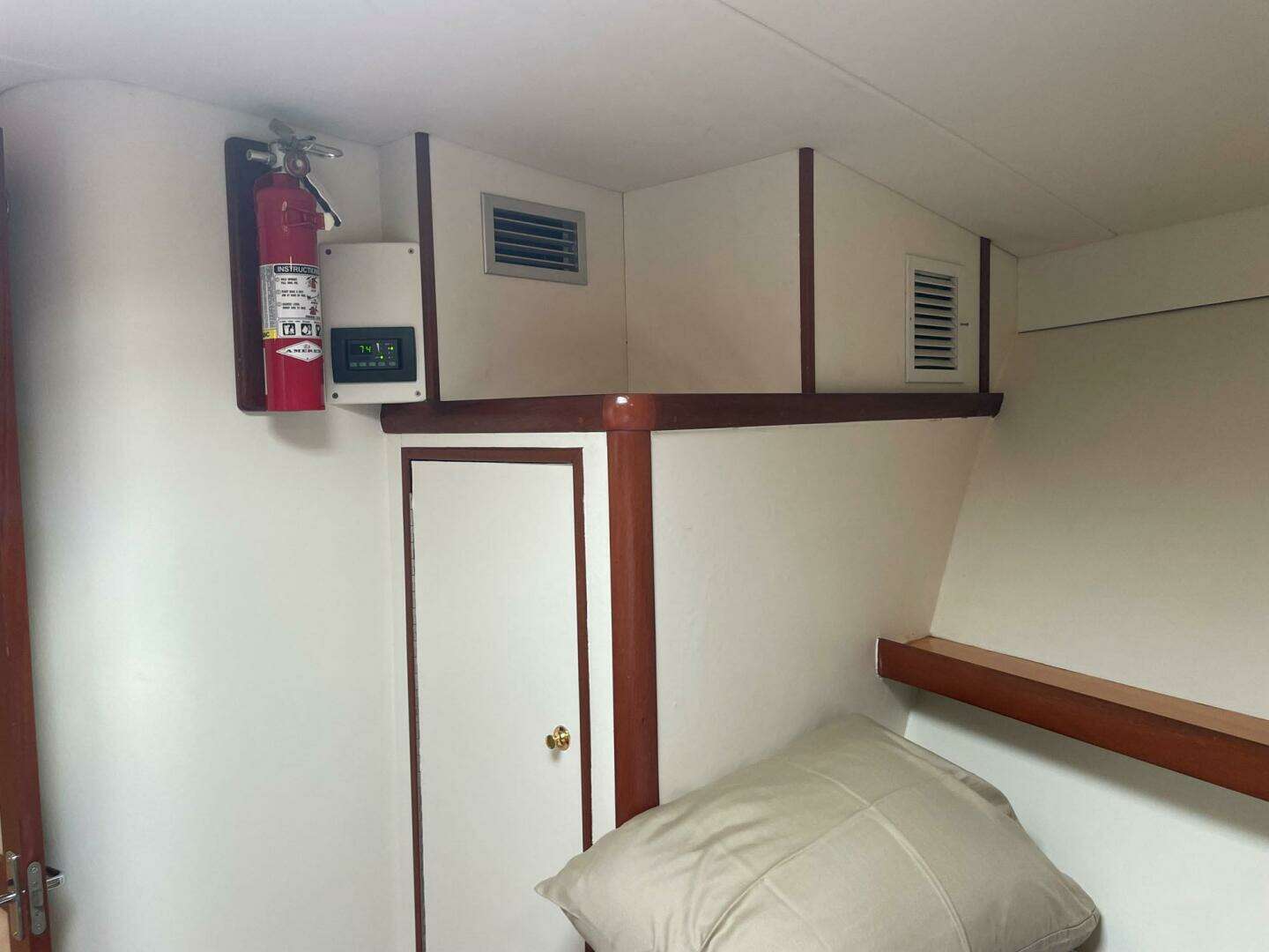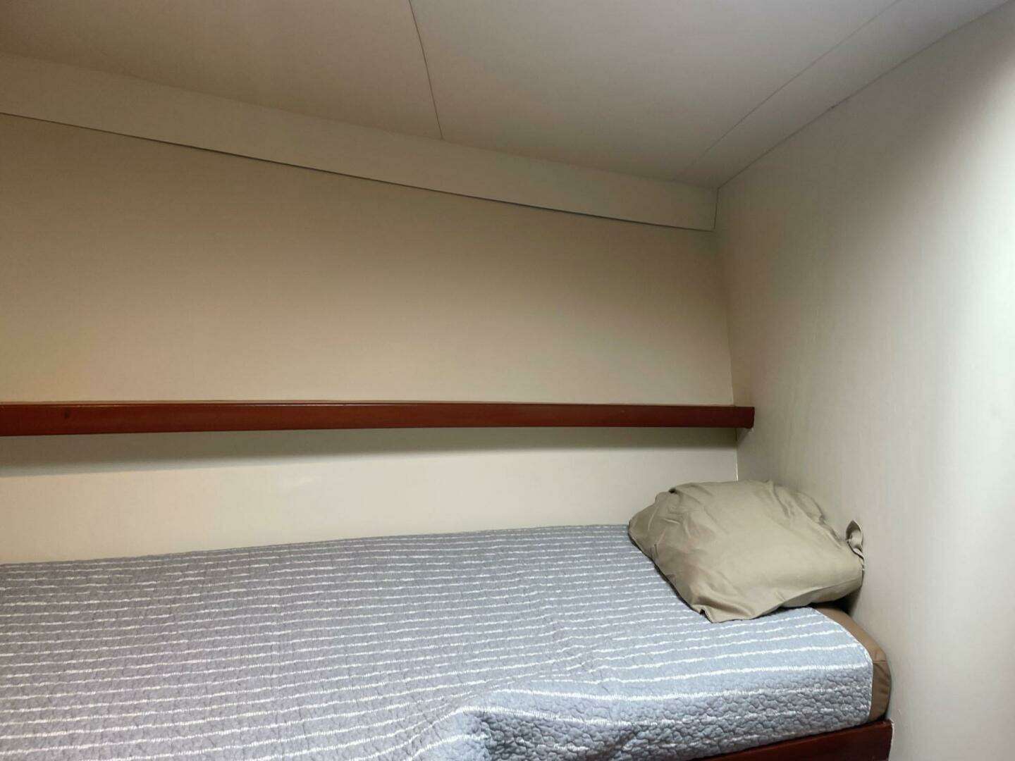 Crew/Guest cabin is on the port side down from companionway stairs and features over/under bunks and ample drawers for storage. Walls and drawers are white Formica with satin-finished teak trim. The floor is cherry with black accent grooves. Climate controlled with stand-alone AC/Heat unit.