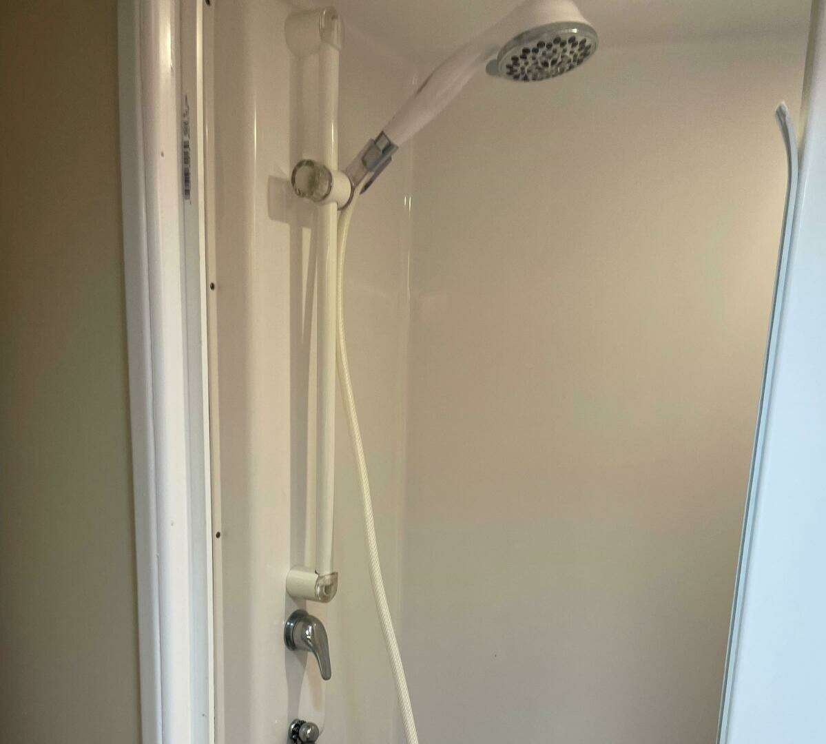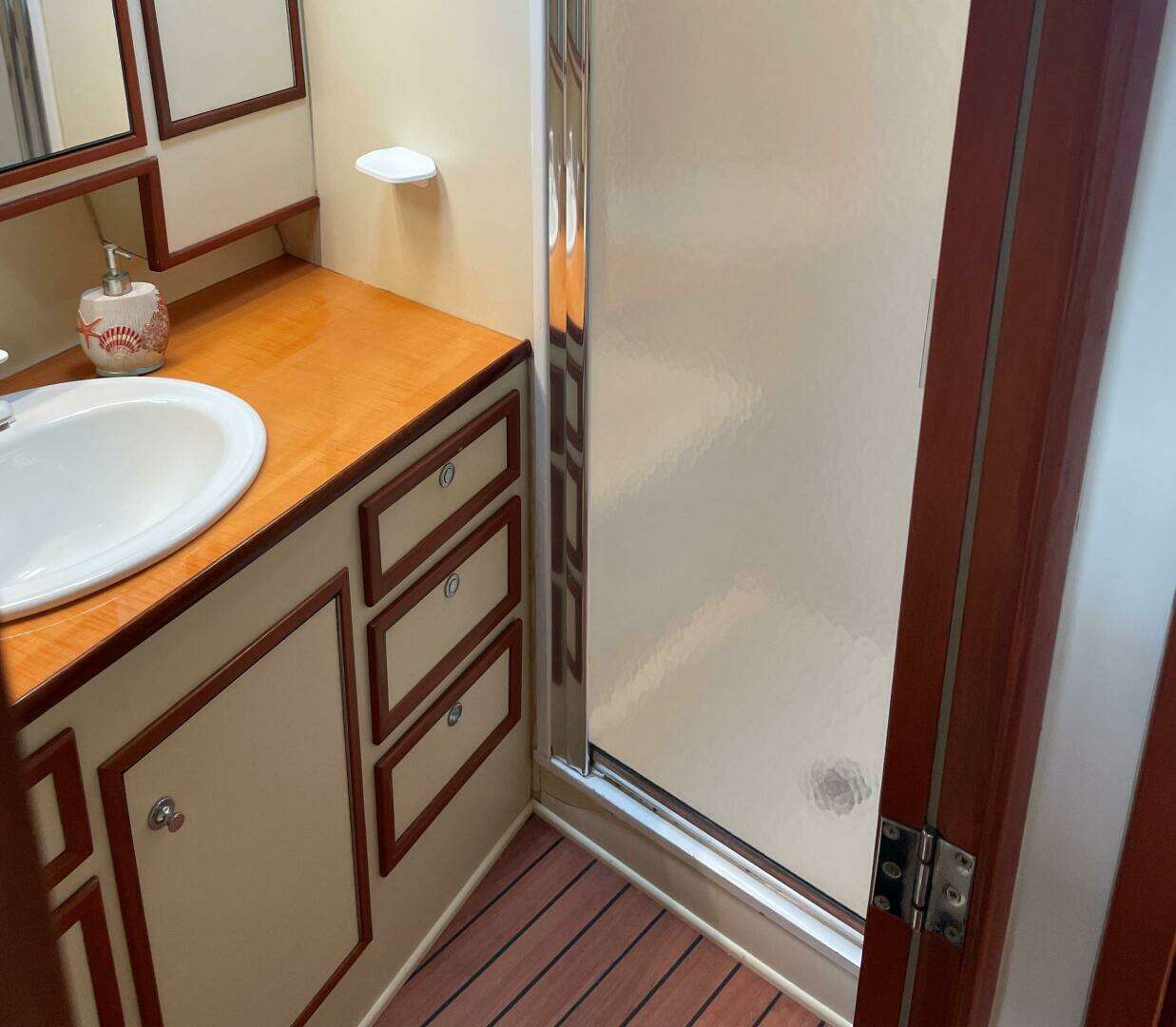 There are two heads--port side and starboard. Both have undermounted sinks in vanity countertop and separate shower stalls. Plenty of drawers for storage. Walls and drawers are white Formica with satin-finished teak trim. The floors are cherry with black accent grooves.