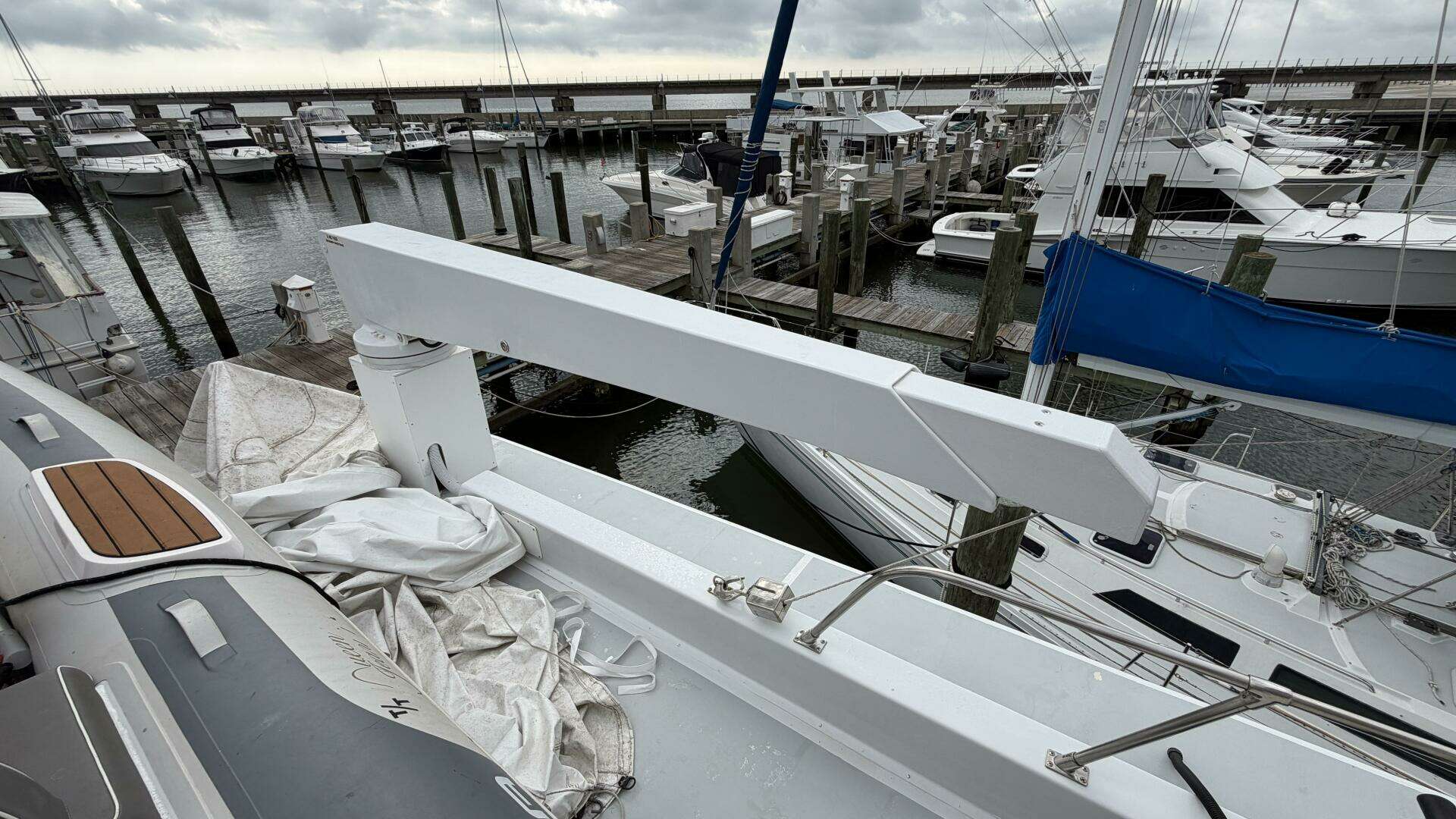 A 2021 Vikings Gala tender with 60HP Yamaha outboard sits securely on the Marquipt hydraulic self-rotating davit, making tender operations effortless.