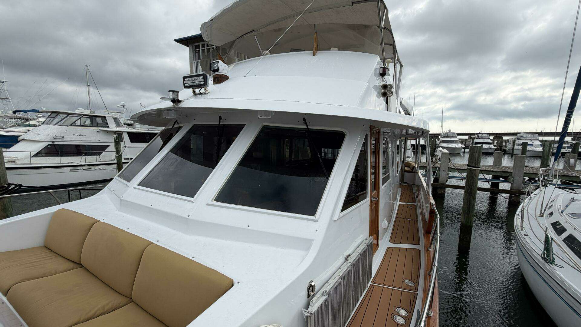 Queen Jeannine is a 57' cockpit version of the Island Gypsy 51, featuring a flybridge, walk-around decks, and a comfortable lounge area on the forward deck. Her classic trawler lines are paired with modern comfort and numerous upgrades that make her an exceptional long-range cruiser or liveaboard.