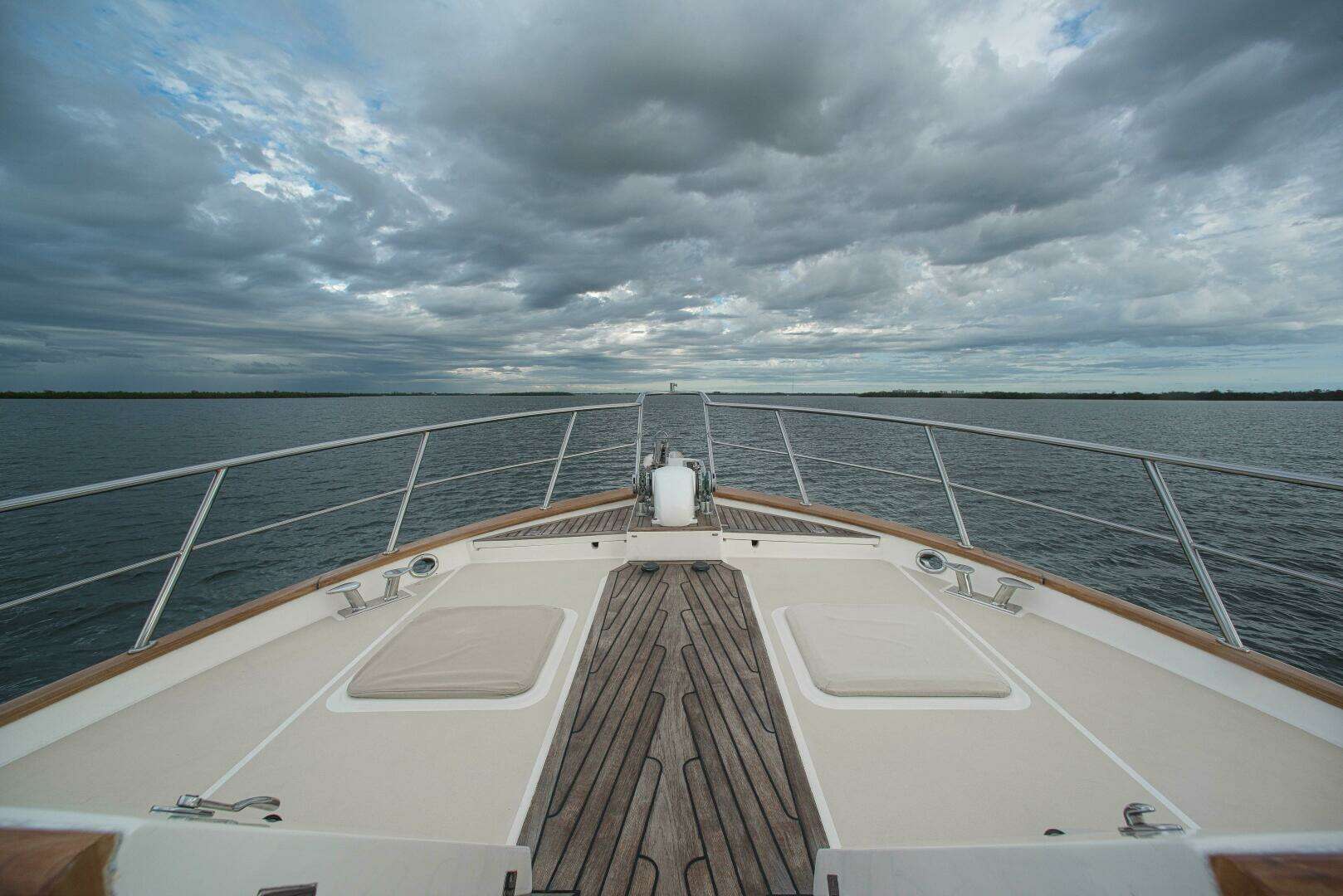 The raised pilothouse, Portuguese bridge, and wide side decks, combined with her state of the art semi-displacement hull makes the Marlow Explorer one of the most comfortable and safest yachts in any sea condition. Her spacious side decks are fully protected by fiberglass bulwarks topped with teak cap rails that are waist high aft and even higher as you move forward. The foredeck is accessed through the lockable Portuguese bridge doors. The twin stainless steel anchors are set up with a Delta anchor with 200 ft. of chain rode on the port side and a CQR anchor with 200 ft. of chain on the starboard side of the dual Maxwell 2200 windlass. The windlass is controlled by foot switches on the deck immediately aft or from switches at both helm stations. On either side of the windlass, deck lockers open to expose the forward 50A shore power cords, each with a Glendenning Cable Master. Faucets for the fresh and salt water wash downs are also in these lockers. The fuel tanks, fresh water and drinking water can be filled from either side of the yacht. The fuel fill is in a locker that is conveniently located amidships about 12" above the deck. The water fills are located on either side of the pilothouse, right below the forward windshield. The black water pump out can be easily accessed on both the port and starboards sides, therefore spinning the boat in a marina for pump out, water or fuel service is never a hassle on a Marlow Explorer.