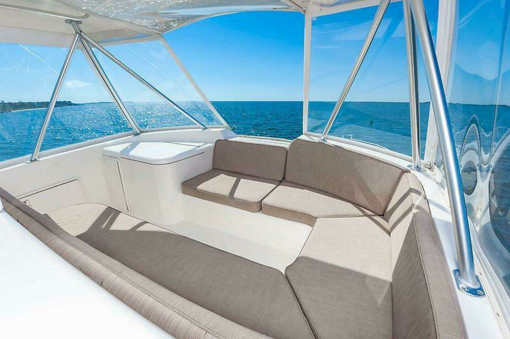 Flying Bridge: (2) helm chairs, additional rod holders across the back rail, Flying Bridge release for the Outriggers, Single Lever Palm Beach style controls, Teaser Reels, Garmin and Simrad Electronics. U-shaped seating ahead of the console and Refrigerated drink box, all on the bridge.