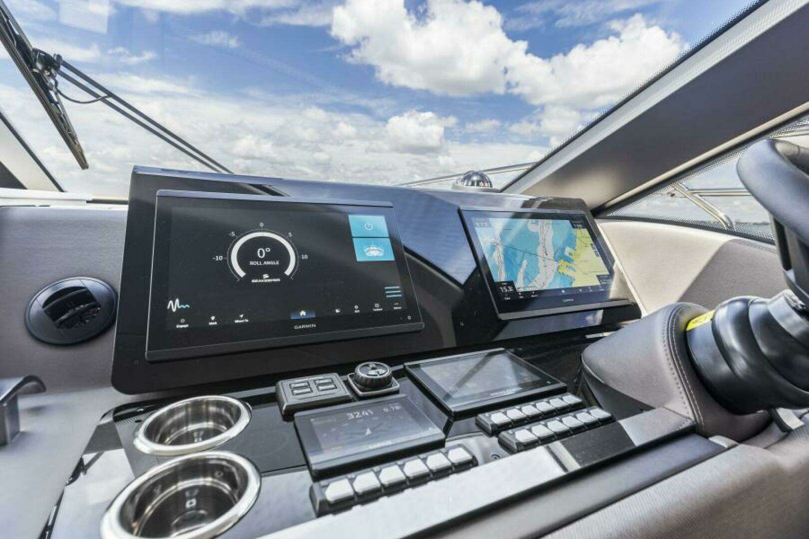 - 2 multifunction 16" screens, 1 multifunction 16" screen on flybridge, Garmin VHF, Garmin automatic pilot for IPS, Volvo engine interface Stainless steel rear mount, Open array radar