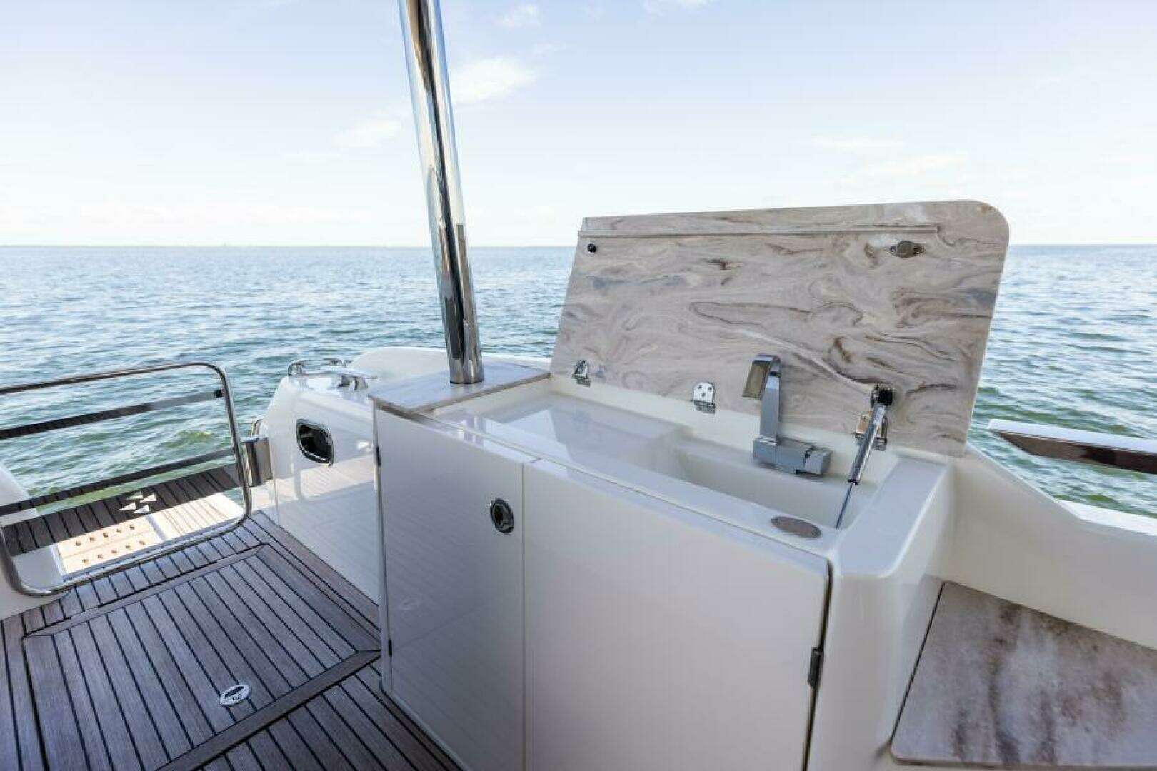 - The yacht features a sleek, modern exterior design with clean lines and a sporty profile.