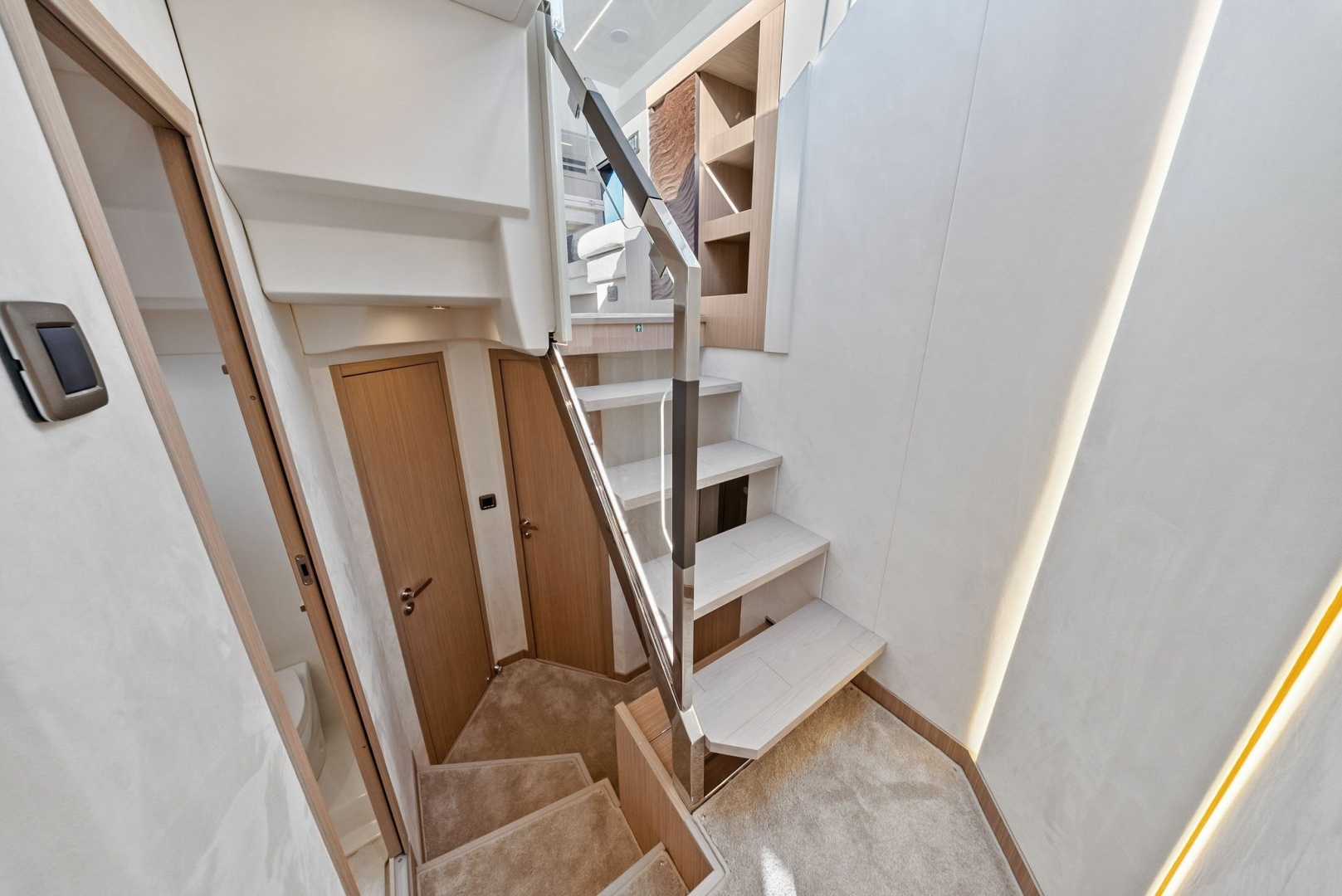 Accommodations include well-appointed staterooms with en-suite bathrooms, highlighted by a stunning master suite with panoramic views, a king-sized bed, and ample storage. Outdoor spaces include a stylish aft deck for alfresco dining, a flybridge with sunbathing areas and potential wet bar, and advanced navigation systems for safe, smooth cruising.