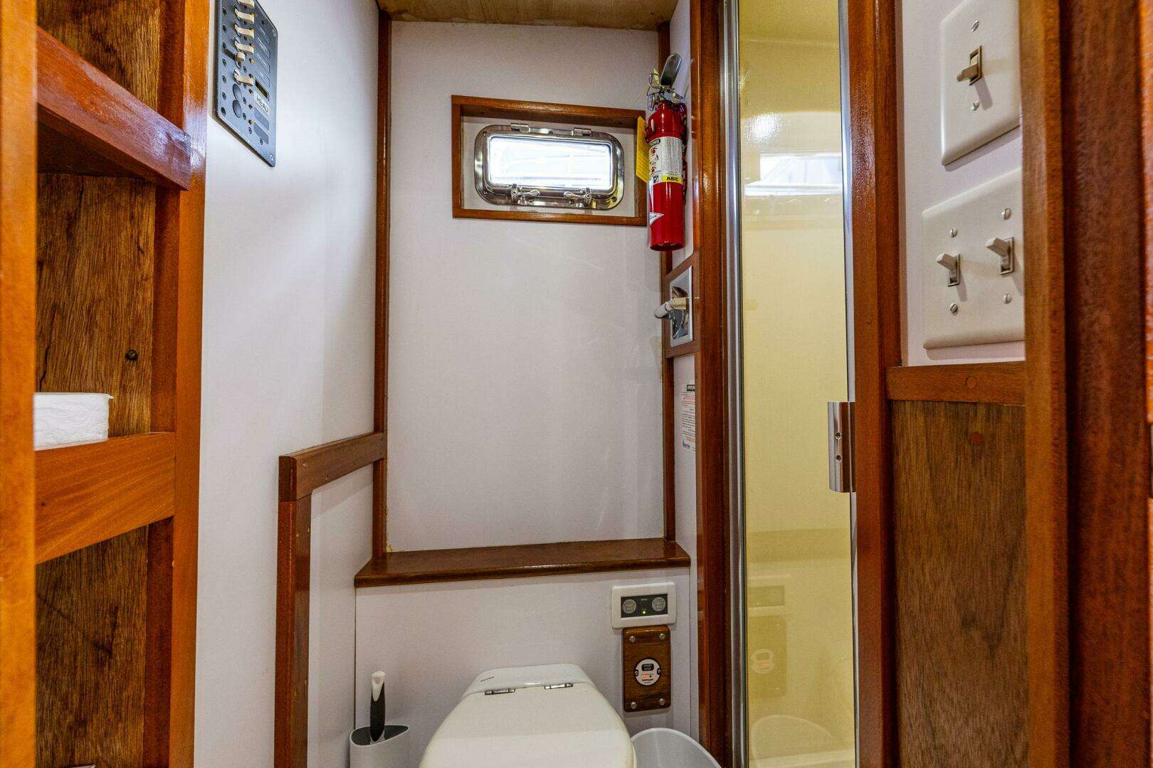The last on deck stateroom is complete with 2 single berths, an upper and lower bunk. Perfect for crew or kids! Complete with an en suite head and shower.