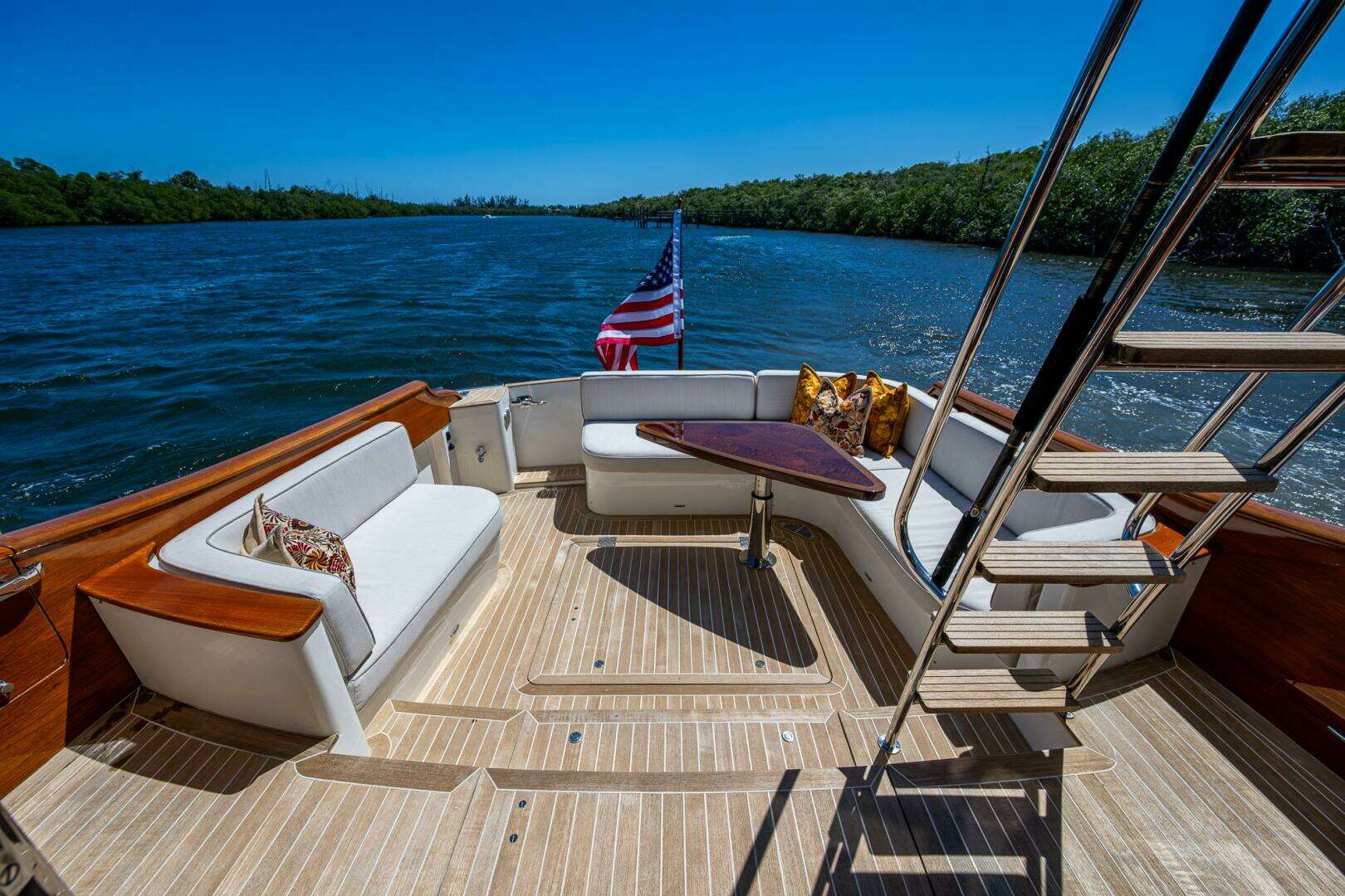 The flybridge has been completely redesigned to include teak decking, powered Stidd helm chairs, a varnished cocktail table, and a full Garmin navigation suite, making it both a luxurious entertaining space and a capable command center.