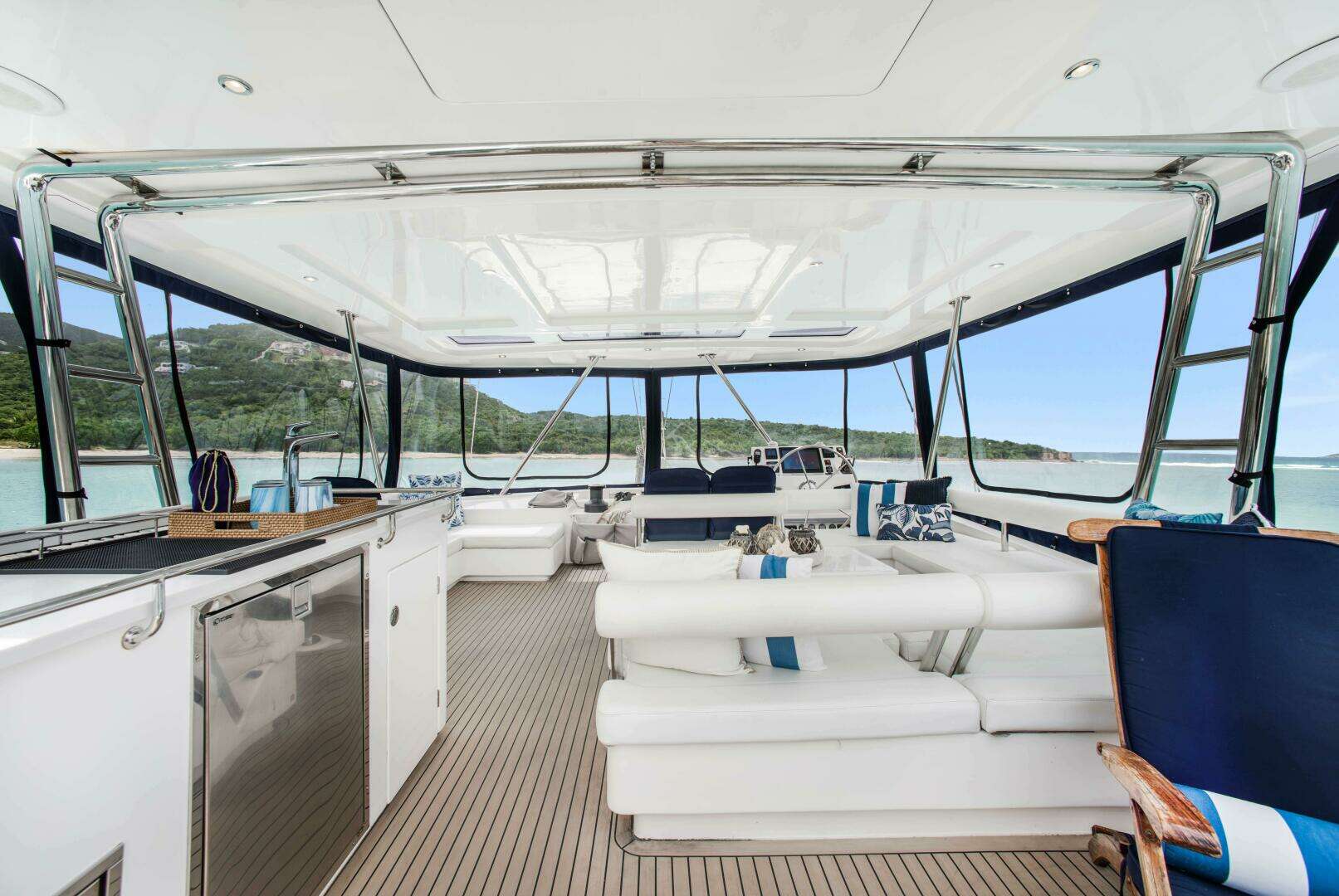 - Expansive bow area with trampoline nets and undercover cocktail and dining area.