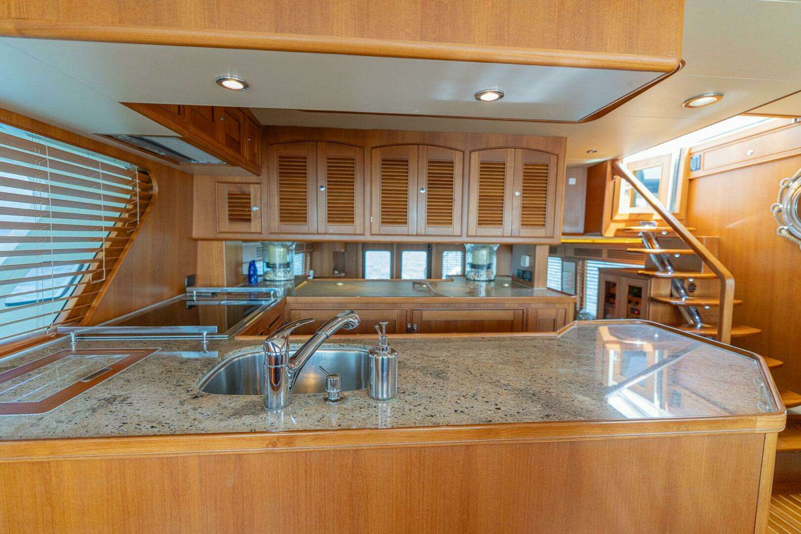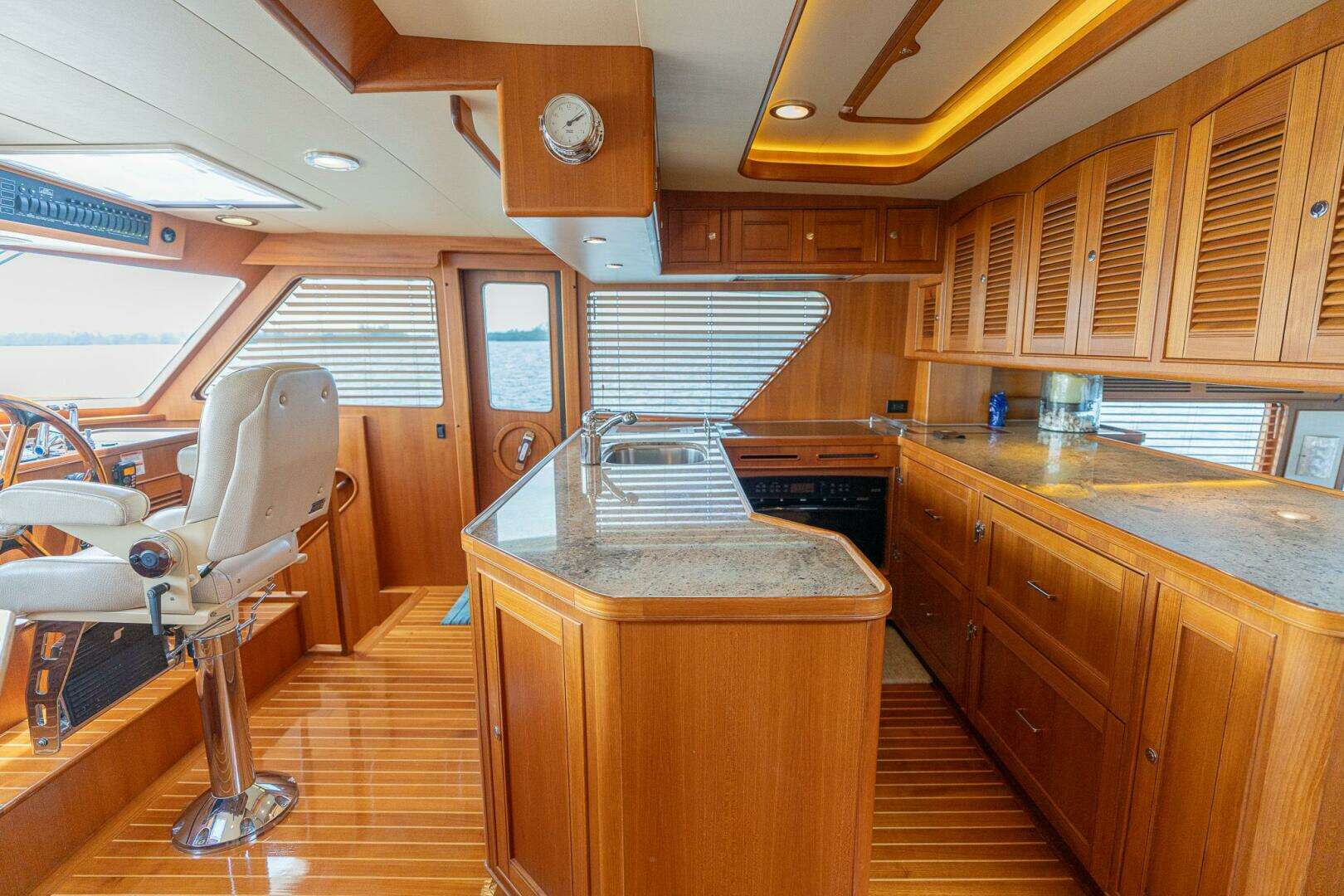 As you walk forward and up a couple of steps on the port side you come up to the pilothouse/galley area. Here you will find a gourmet galley aft and large Pilothouse and dining area forward. A set of stairs on the starboard side lead you down to the companion way and 3 staterooms.