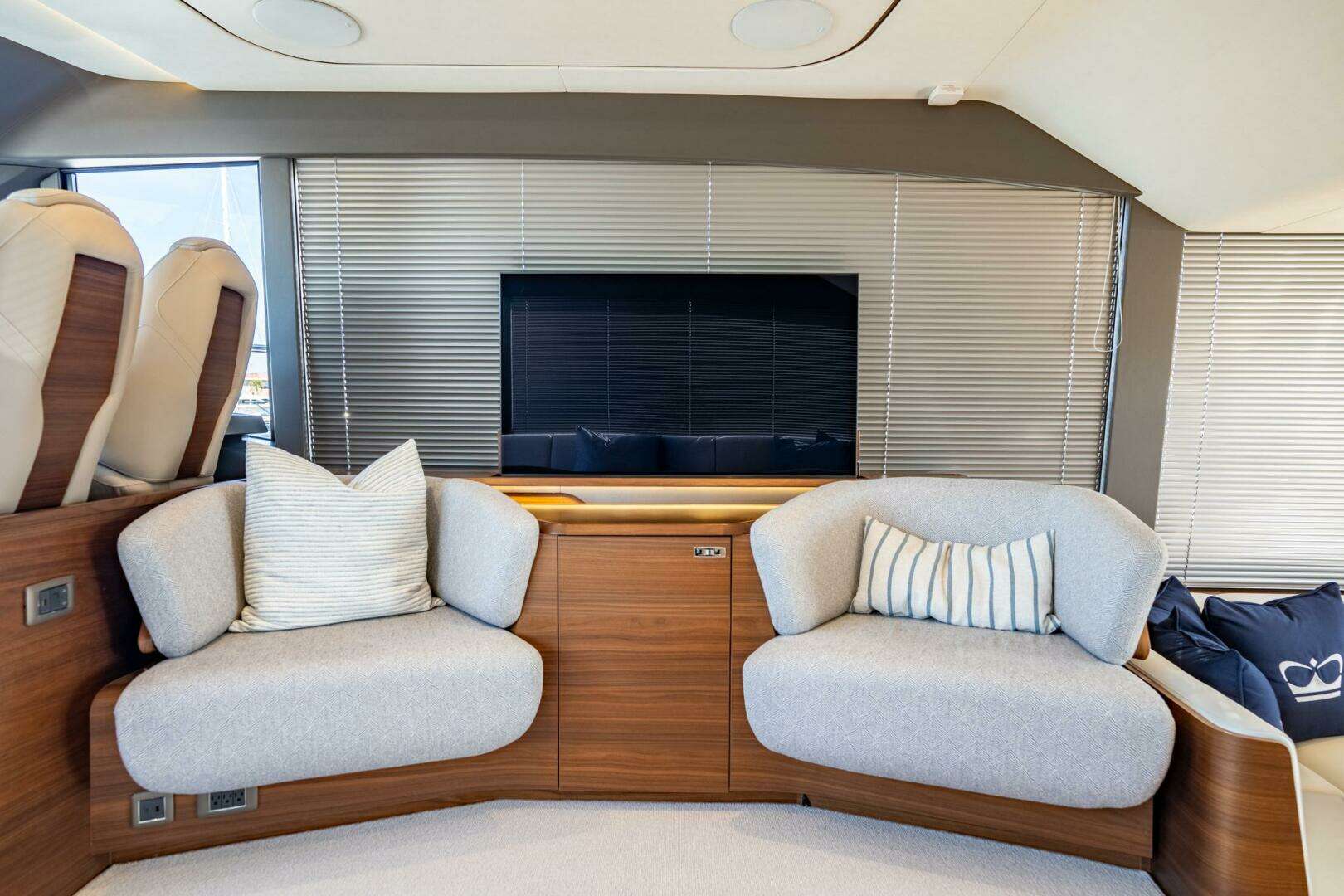 Welcome aboard HMY Yachts In-stock Princess F58 Hull 011. The Princess F58 was unveiled to the public at Boot Düsseldorf in January 2025, receiving tremendous acclaim. This model replaces the popular Princess F55 and showcases a remarkable collaboration among Princess Design Studio, Pininfarina, an