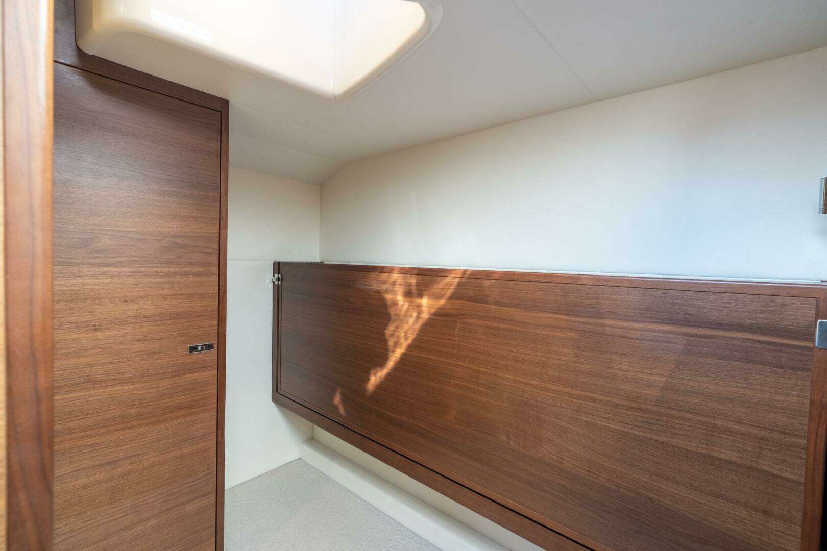 The F58 features three elegantly designed cabins and two bathrooms. The forward VIP guest cabin provides a luxurious retreat, while the twin cabin to starboard can easily convert to a double with sliding berths, offering flexible sleeping arrangements. The full-beam owner's cabin, situated amidships, boasts a spacious layout that includes an ensuite bathroom and a walk-in wardrobe. In addition, there is a separate crew cabin located at the aft end, equipped with two bunks, a wardrobe, and a dedicated bathroom for crew convenience.