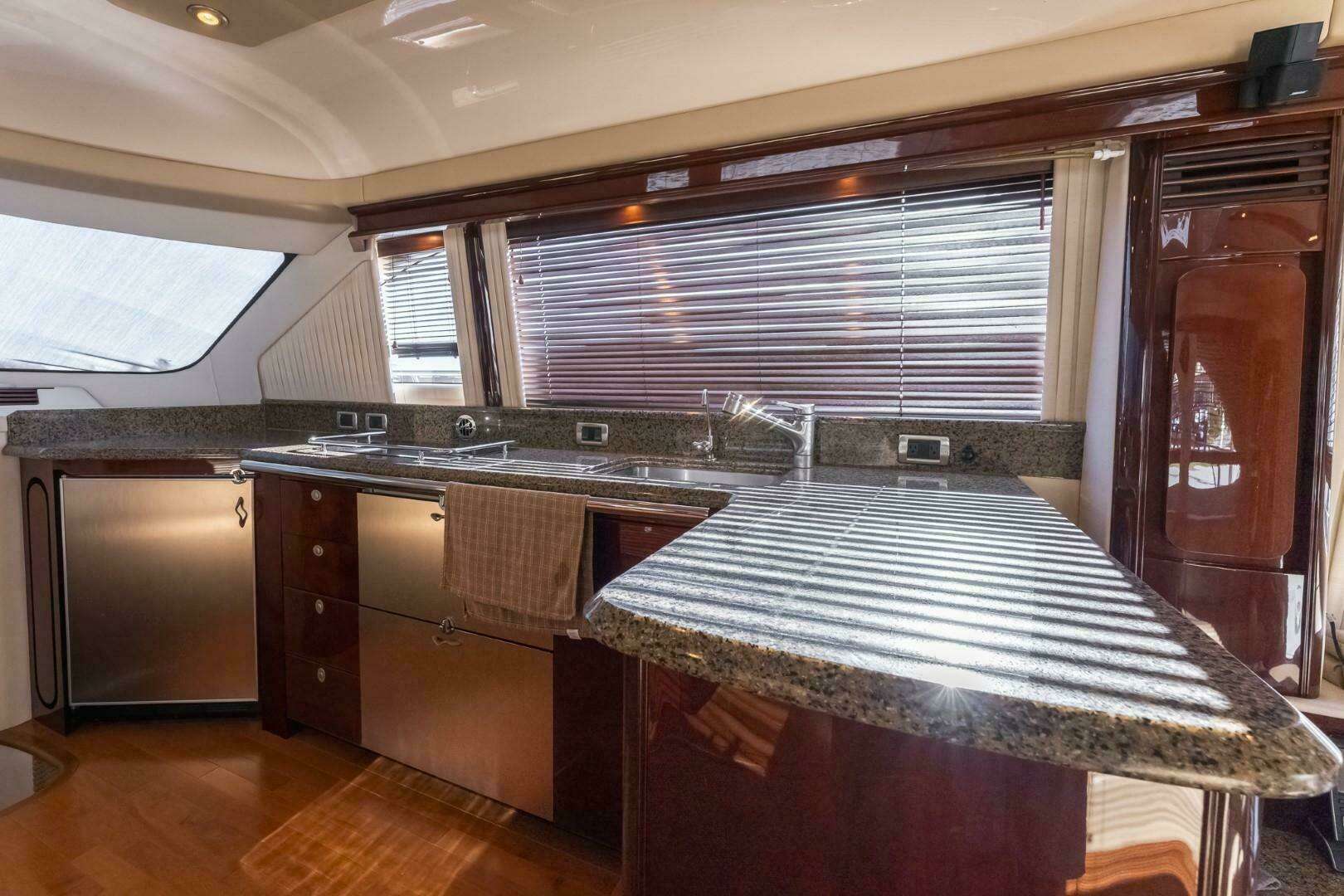 Fully equipped galley with refrigerator and freezer with built-in icemaker, microwave, and coffeemaker