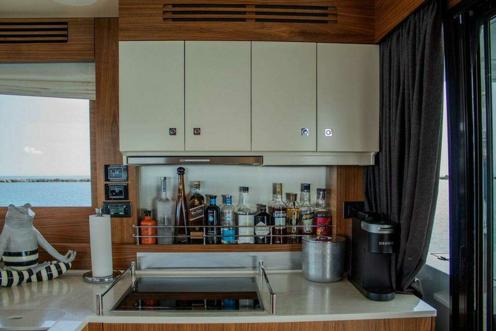 Galley at the entrance of saloon at starboard sideWooden flooringLow and high cupboards and bottle drawer at starboard side Miele refrigerator/freezer 9.2 cu.ft. 268lt (196lt + 72lt) at portside Storage area with shelves at portsideWorktop in CorianStainless steel sinkWater mixerMiele four-hob glass ceramic cooktopStainless steel pan holderMiele ovenMiele extraction hoodLED spotlightsRubbish binCurtain on the entrance door1 AC socket