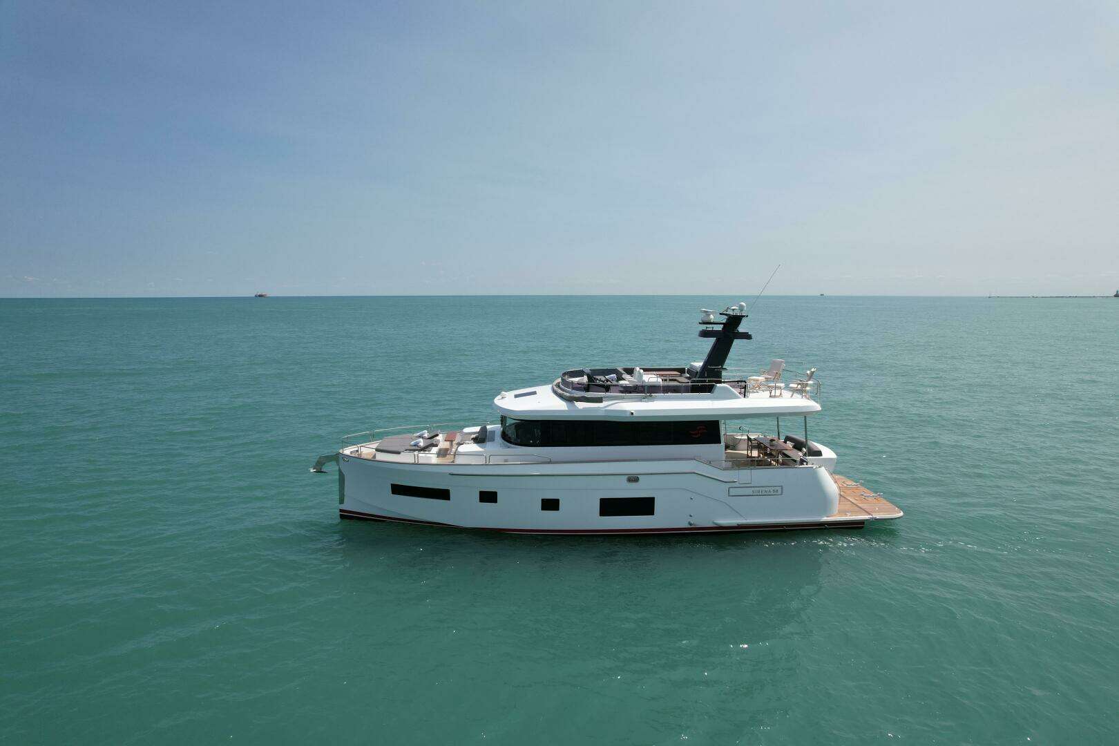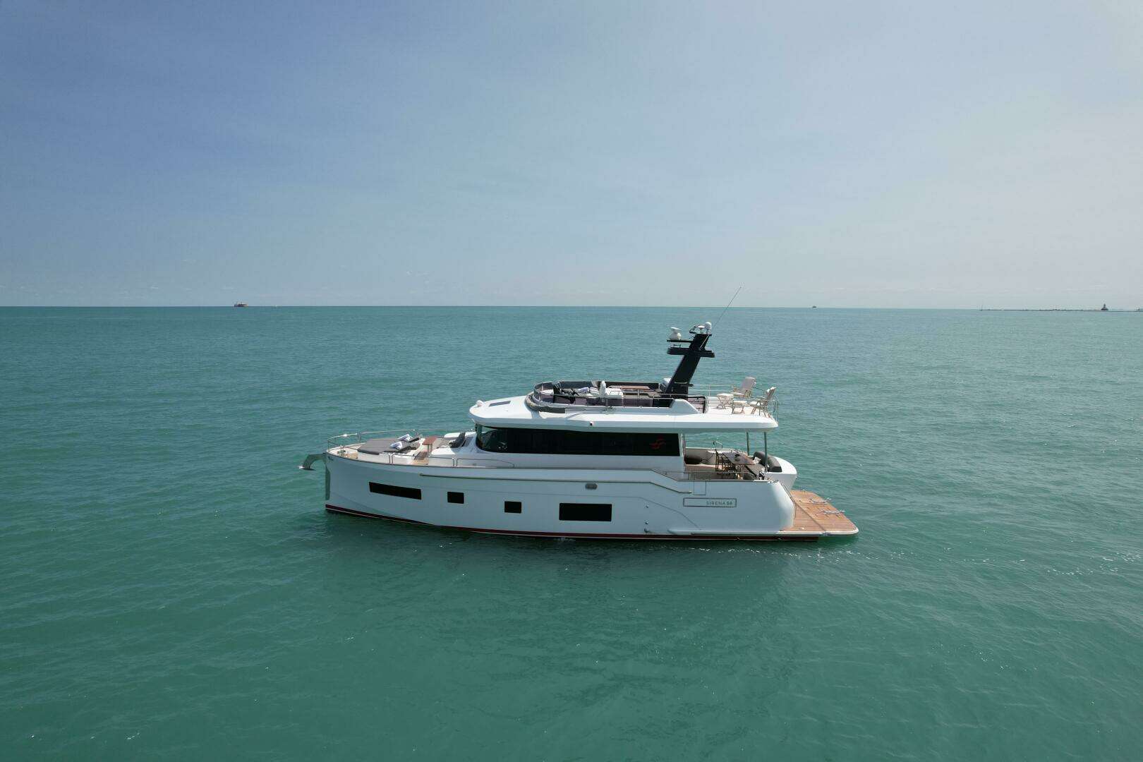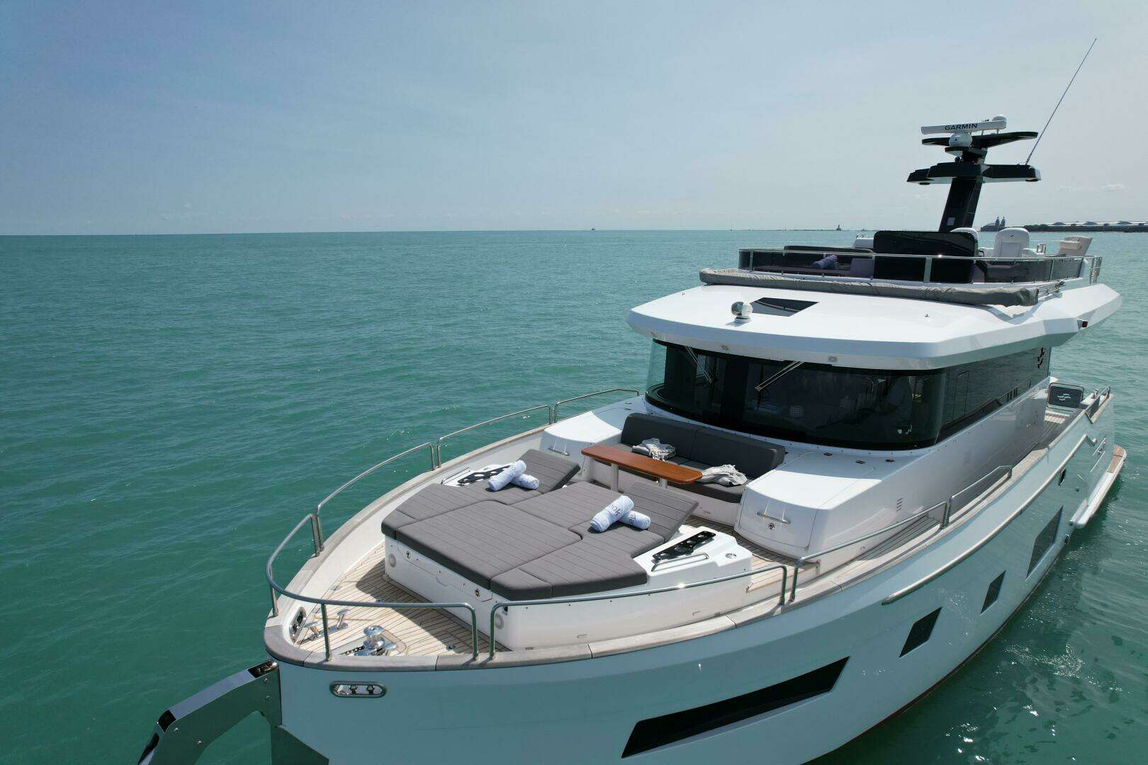 Volvo Joystick Control for Engines and Thrusters on MainHelm and BridgeVolvo Controls and Joystick for 3rd Station GRP UnitFresh Water Deck Wash SystemSeakeeper Stabilizer 9Garmin Platinum Package 2 Chartplotters:Open Array Garmin 6Kw HDOne additional Garmin Chartplotter for PlatinumPackageGarmin Instrument DisplayGarmin IP Camera in Engine Room & FlybridgeMakefast Electro-Hydraulic Bimini Top with Folding Radar Totem MastForedeck Manual Hi-Lo Table with Teak TopTeak Laid Foredeck FloorTeak on PlatformElectric Searchlight with Control on Main Helm &BridgeCourtesy Lights on Flyridge and Main DeckTwo Bi-Color Underwater Lights on SternThree Flood Lights on Aft FlybridgeBBQ, Refrigerator, and Icemaker on FlybridgeCockpit GRP Unit for Storage, Refrigerator, andJoystickVarnished Teak Top of Exterior TablesFixed Cockpit Table with Teak Top2 Folding Chairs for CockpitPantograph Door on SternCrew cabinSalon Side Entrance with Pantograph DoorPortholes with Mosquito Screens in Master StateroomMiele Dishwasher in GalleySafe in Master CabinCutlery and Dinnerware Set for 6 with Sirena LogosTVs for Twin Cabin, VIP Cabin, Master Cabin &SalonFusion AV755 Audio / Video System for SeparateCabinsFusion RA70 Audio System for Exterior withSpeakersHeads Upgraded to Marble
