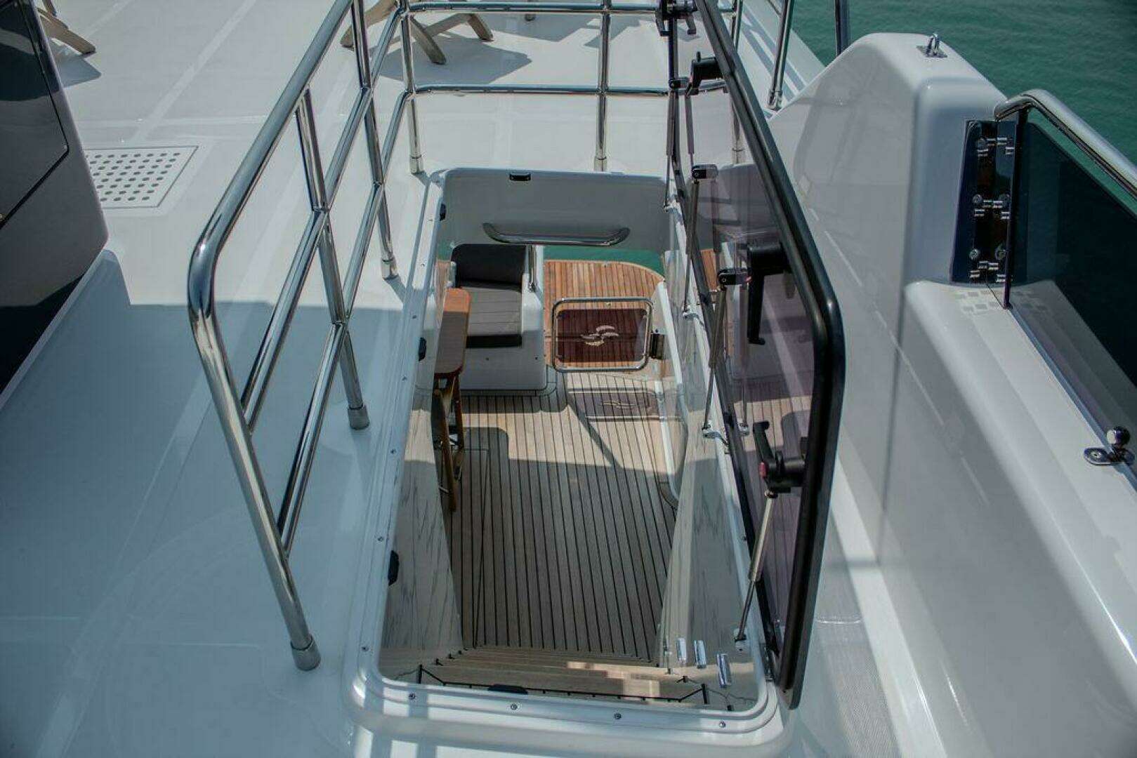 Stainless steel pulpitAntiskid surfaceNr. 2 Stainless steel hawsesNr. 2 Stainless steel mushroom bollardsFixed bow anchor rollerStainless steel anchor shield on bow1700 W Lofrans anchor windlass with mooring supportUltra 45kg stainless steel anchor250’ high resistance chain with 3/8” diameterChain wash down systemSelf draining chain locker and housing for 8 fendersSofa with removable cushions and storage underneathSunbathing area with removable cushions and storage underneath. Stainless steel handrails and Plexiglas® cup holdersPlexiglas® cup holdersCovers for seats, sun bathing cushionsSide walking areas and first steps of bow area entrance in teakNr. 2 fuel fillers covered by GRPNr. 2 stainless steel fairlead with cleats inside at mid-shipFresh water filling inletBlack water deck suction discharge outlet Grey water deck suction discharge outlet Courtesy lights on stepsTeak gunwale